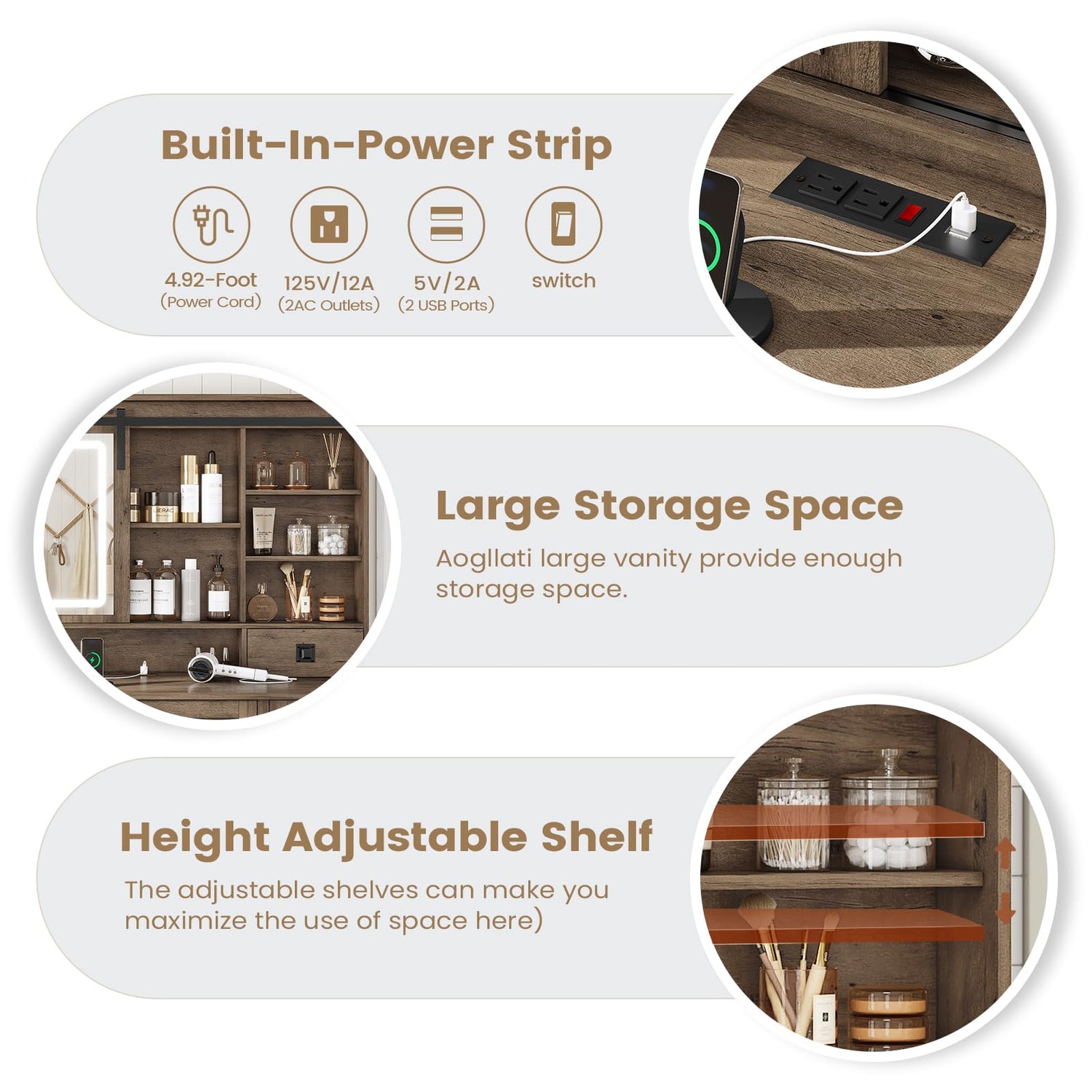 - 【Vanity Desk with Charging Station】AOGLLAIT vanity features a charging station above the tabletop, including 2 standard plug sockets and 2 USB ports, so all your mobile phones, tablets, hair dryer, curling iron, and other small electronic devices can be within arm's reach. You can sit directly in front of this makeup vanity with lights to easily use the curling iron or hair dryer to style your hair.