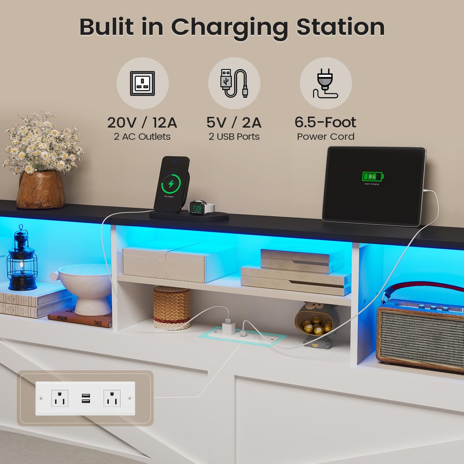 AOGLLATI Farmhouse Queen Bed Frame with 4 Storage Drawers and Led Lights, Wooden Bed Frame Queen Size with Hidden Space Bookcase Headboard and Led Lights & Metal Slats, White