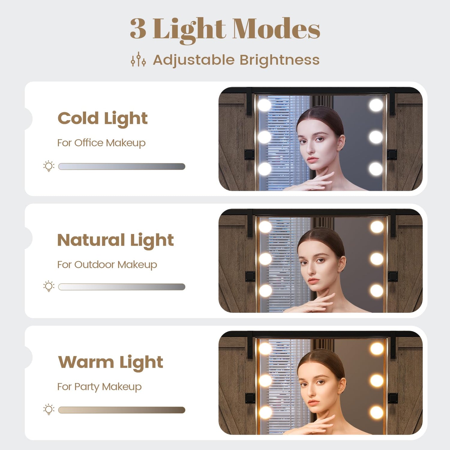 AOGLLATI Makeup Vanity with Lights & Barn Doors, Vanity Desk with Mirror and Lights & Charging Station, Farmhouse Brown Vanity Table with Jewelry Hooks and Open Storage Shelves