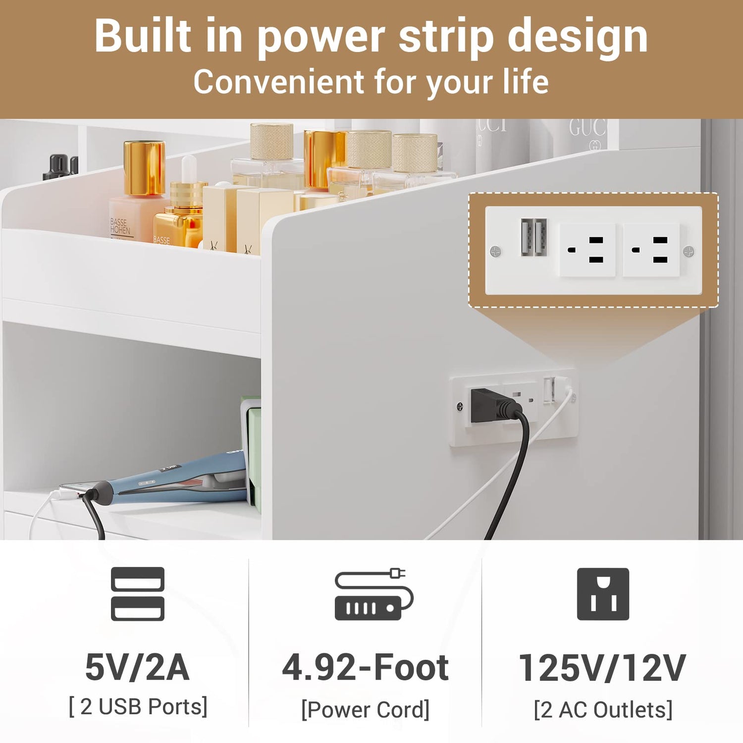 - 1️⃣【White Vanity with Charging Station】 There is a power strip on the side of the makeup vanity desk, which contains 2 USB ports and 2 sockets for you to charge your electronics in time. The vanity with lights has an open storage space on the same side where you can store other items along with your phone, hair dryer, etc; so you can sit directly in front of this make up vanity and easily use your curling iron or hair dryer to do your hair.