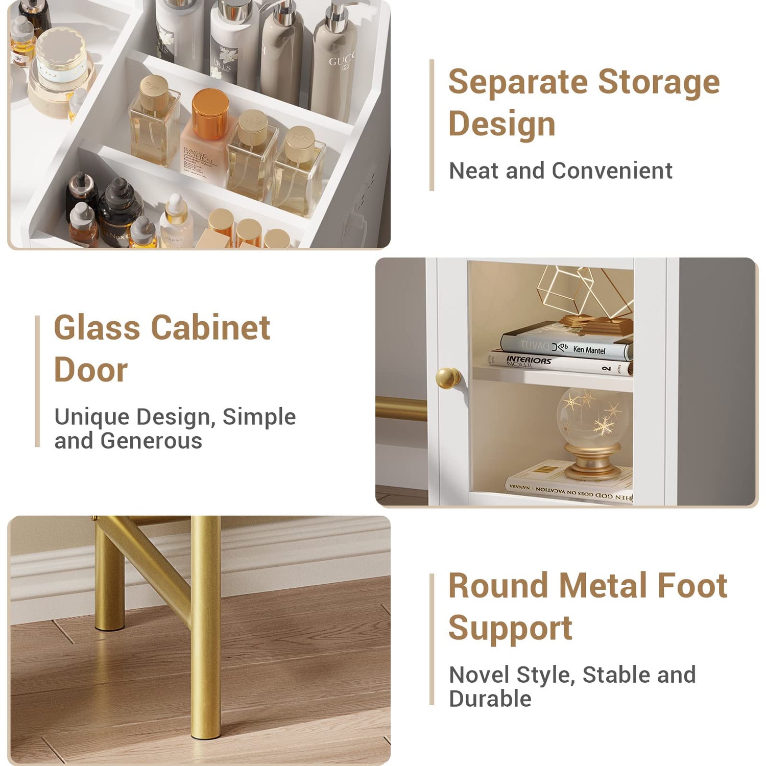- 4️⃣【Sufficient Storage Space】The vanity desk with mirror comes with 3-layer side storage shelves, 3-separate storage compartment, a small drawer, a large drawer with compartment, an open storage drawer, and a glass door cabinet, so you will have enough space to store your jewelry, hair accessories and cosmetics, which can make your desktop neat and tidy, and make your makeup process more easier.