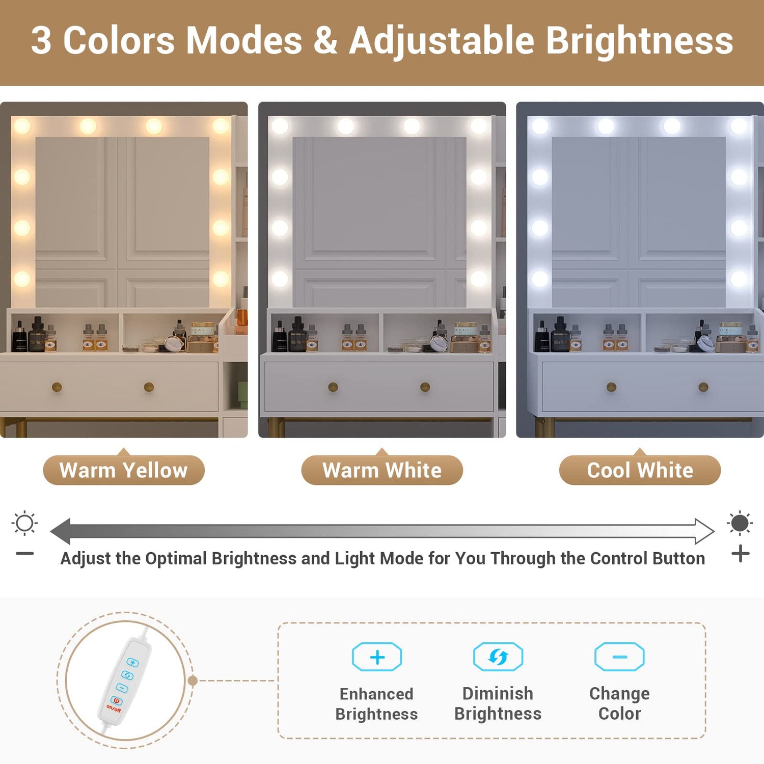 - 2️⃣【10 Hollywood Light Bulbs with 3 Lighting Modes】 The vanity mirror with lights desk comes with 10 Hollywood light bulbs, which are bright enough for natural makeup application, and also this makeup vanity with lights has 3 lighting modes:warm yellow, warm white and cold white light colors. You can adjust the brightness and lighting mode according to your need,which is perfect for home make up, salon or live broadcast.