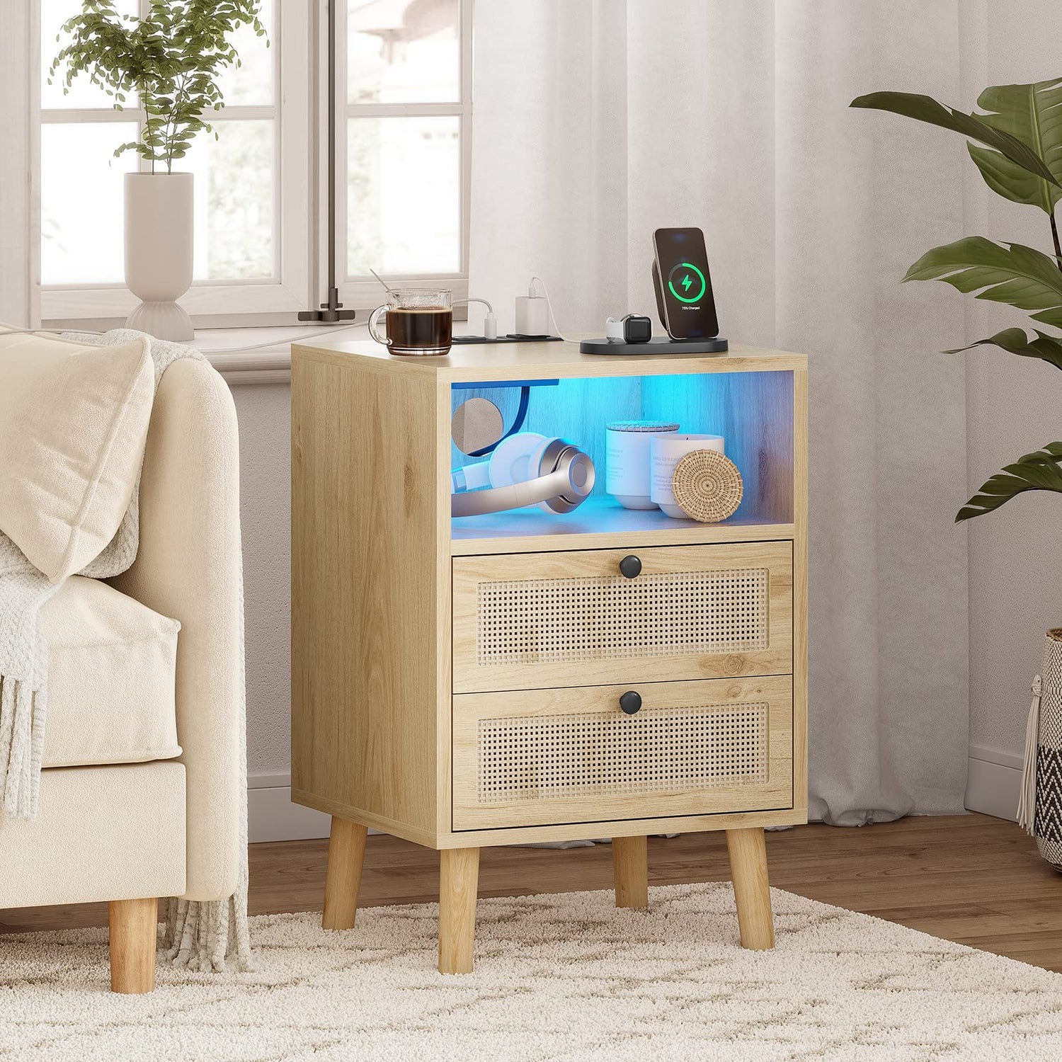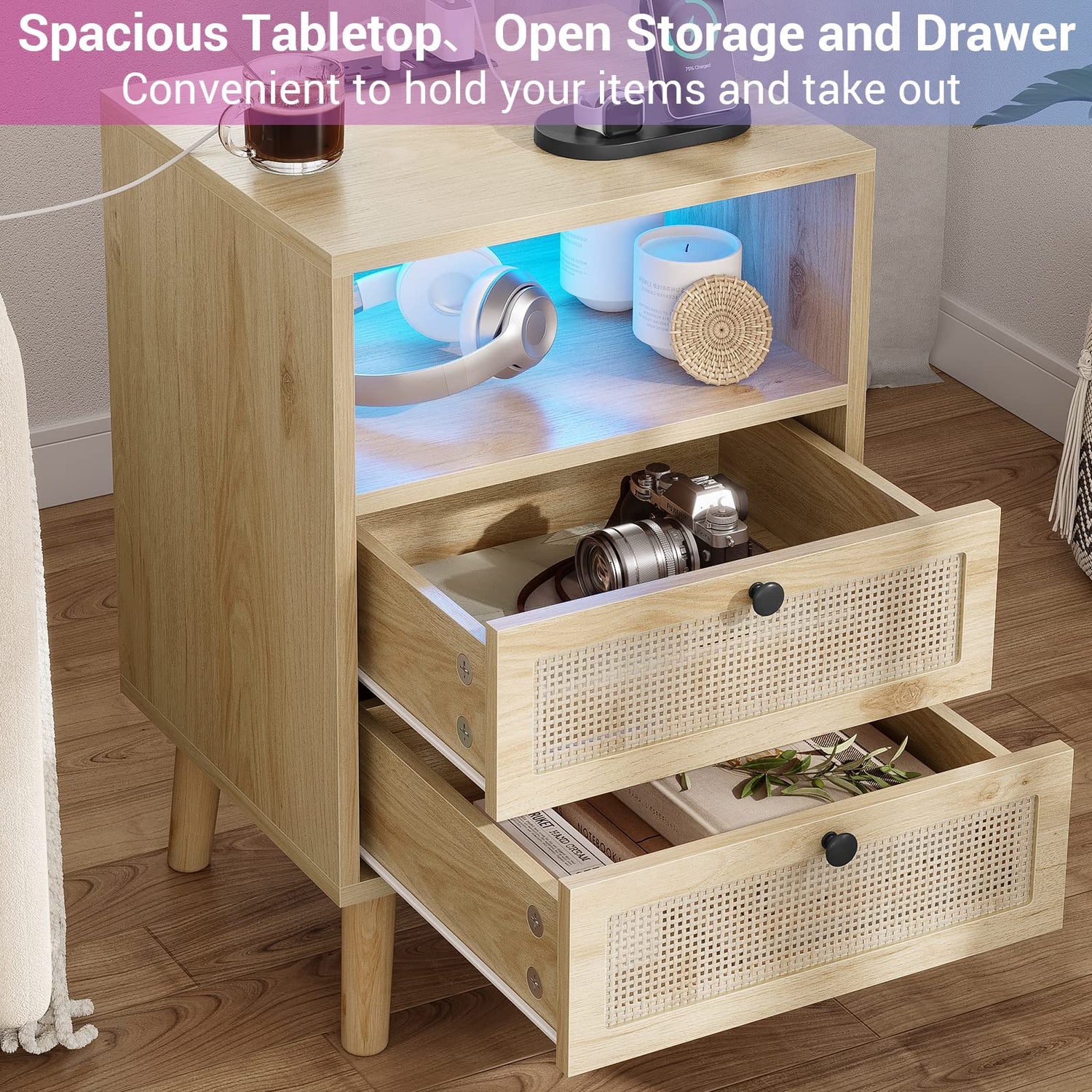 AOGLLATI Rattan Nightstand with Charging Station and LED Lights, LED Night Stand for Bedroom, Wood End Table with USB Ports, Boho Bedside Table with 2 Drawers, Natural