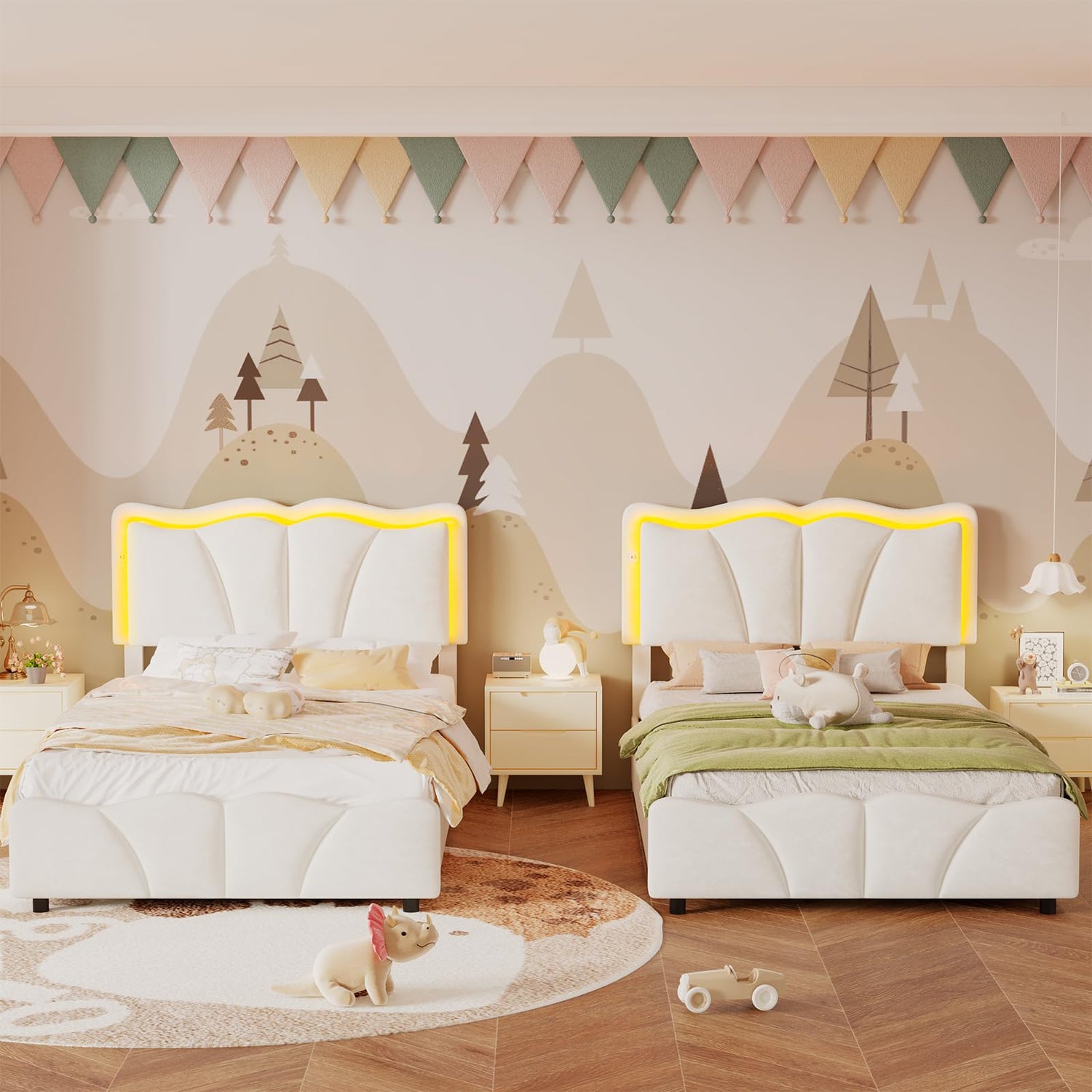 AOGLLATI Twin Bed Frame with 4 Storage Drawers & Charging Station,Upholstered Led Flower Twin Bed with Adjustable Headboard and Strong Wood Slat Support,No Spring Box Needed, Beige