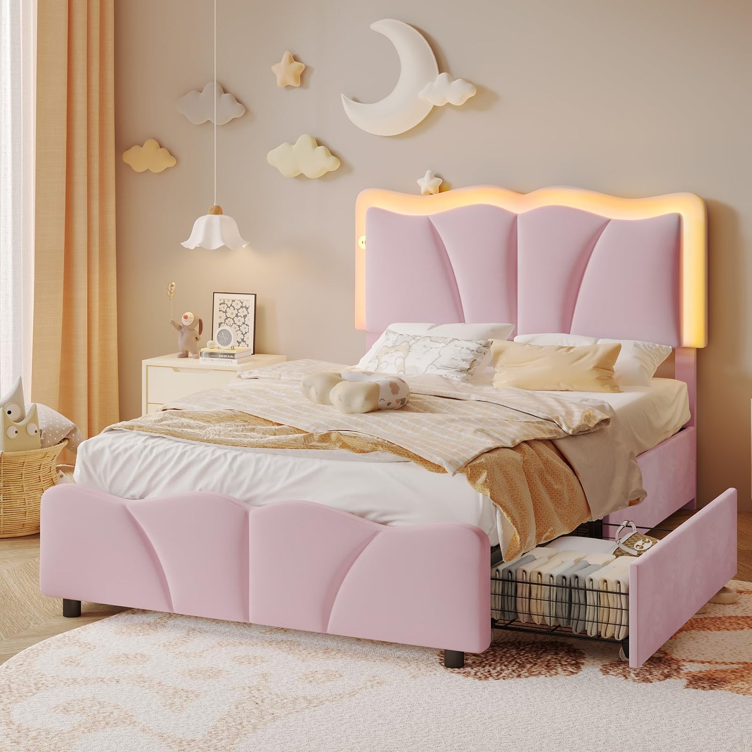 AOGLLATI Twin Bed Frame with 4 Storage Drawers & Charging Station,Upholstered Led Flower Twin Bed with Adjustable Headboard and Strong Wood Slat Support,No Spring Box Needed, Pink
