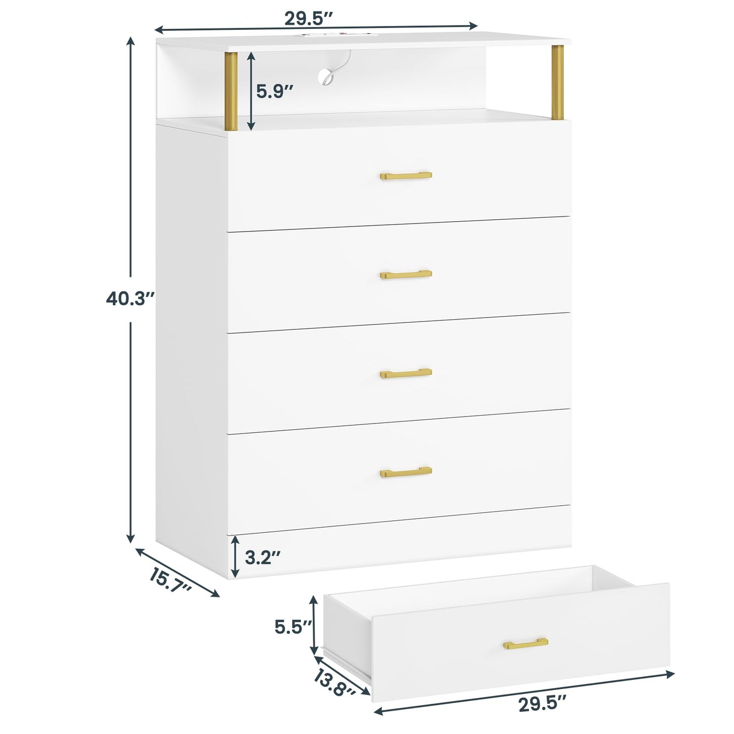 AOGLLATI White Dresser for Bedroom with Column Design, 4 Drawer Dresser with Charging Station, Modern Bedroom Led Tall Dresser for Bedroom Closet