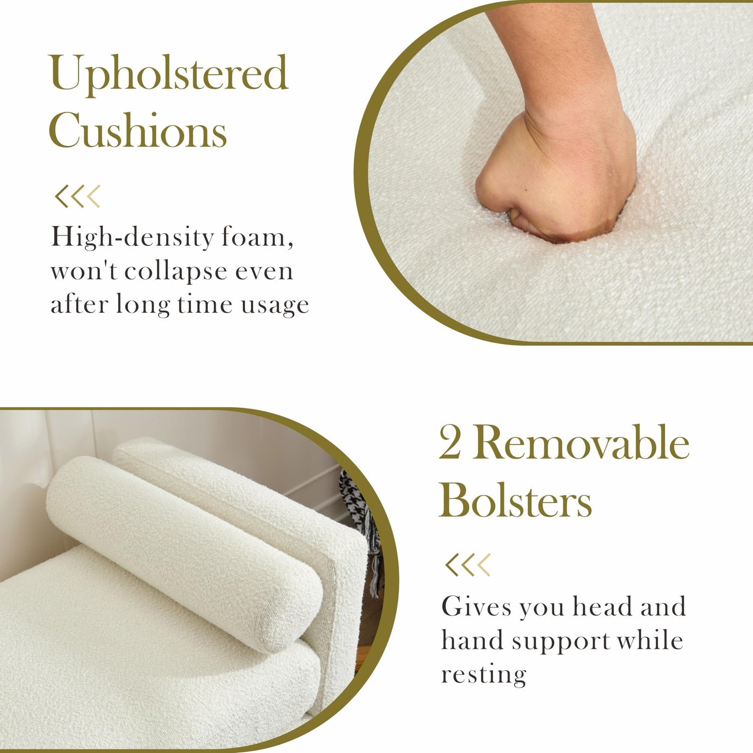 - Upholstered Cushion: The entryway bench interior features an s-spring design filled with 6.89-inch-thick, highly resilient foam to provide a soft but supportive seating experience that springs back perfectly after each use. The fabric is taken from boucle fabric, which is good for the skin again and plush to the touch