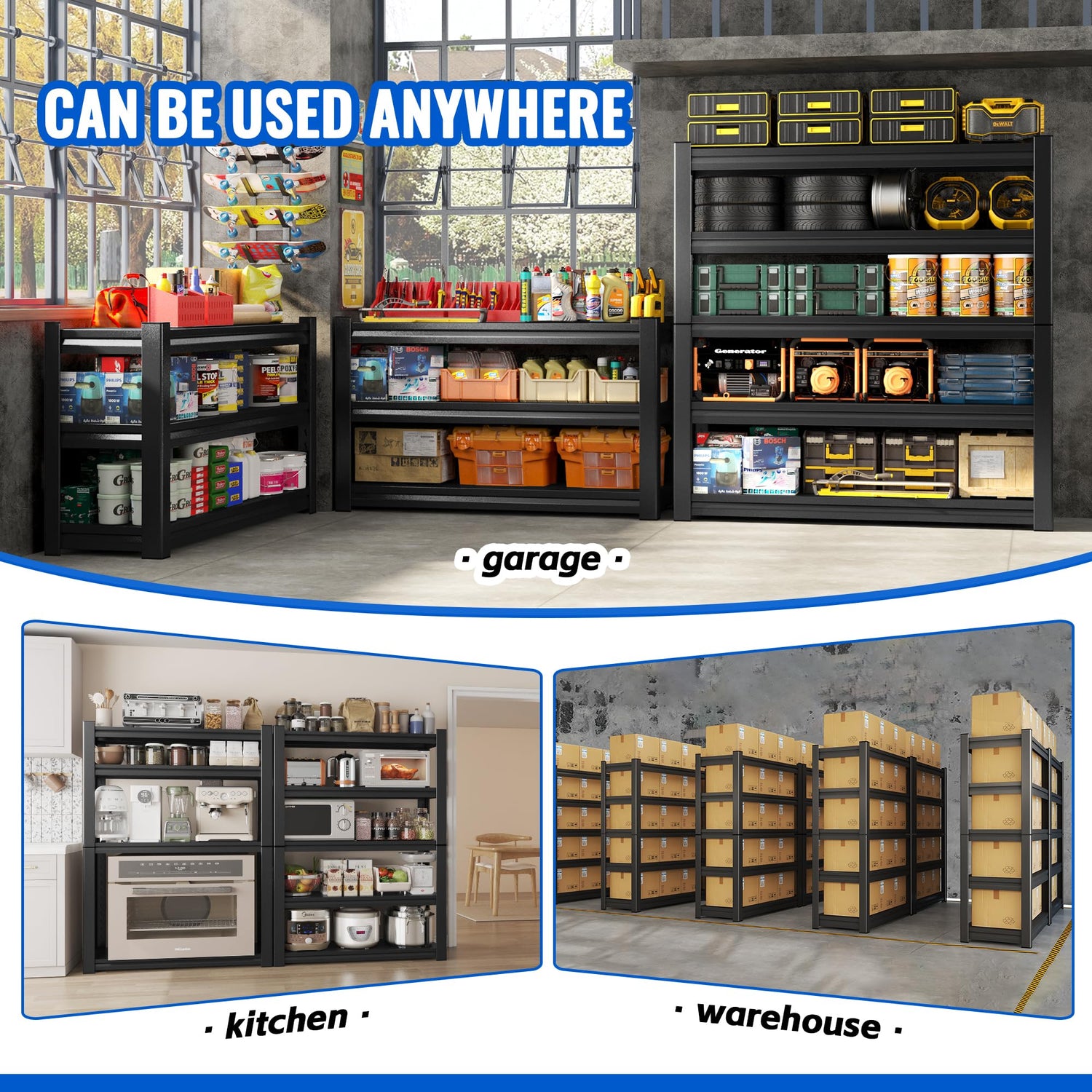 - Multiple Application: This garage shelving units and storage is suitable for use in garage, warehouse, basement, workshop, and more. The 5 tier metal storage shelves not only increase your storage space but also make your home clean and organized