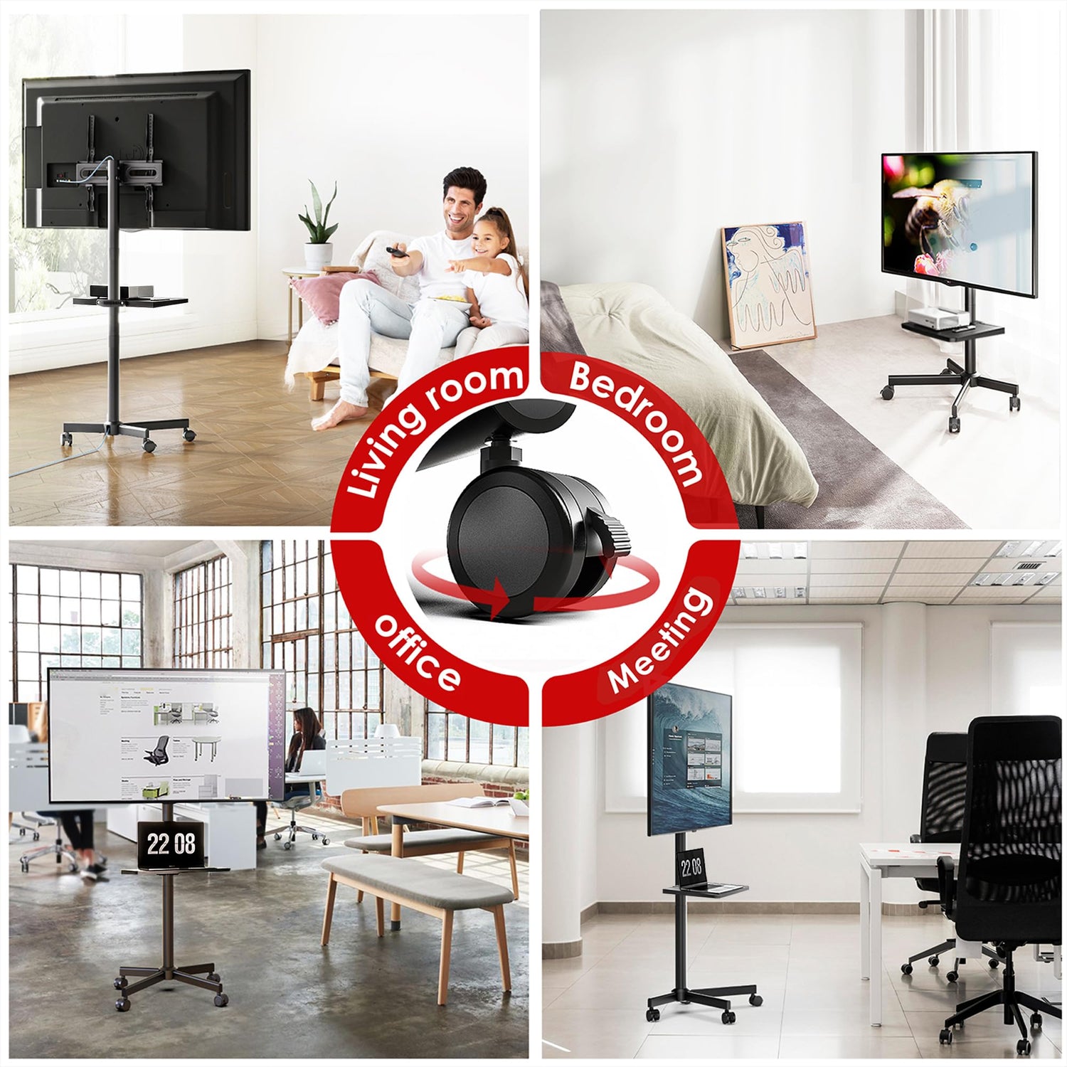 - Quiet Wheels for Smooth Movement:The wheels of the TV shopping cart can roll quietly and smoothly on wood floors and carpets, whether you are working at home, cooking in the kitchen, practicing yoga, or relaxing in the living room, our TV cart can meet your needs. You can lock the wheels and secure the stand when you don't want to move it