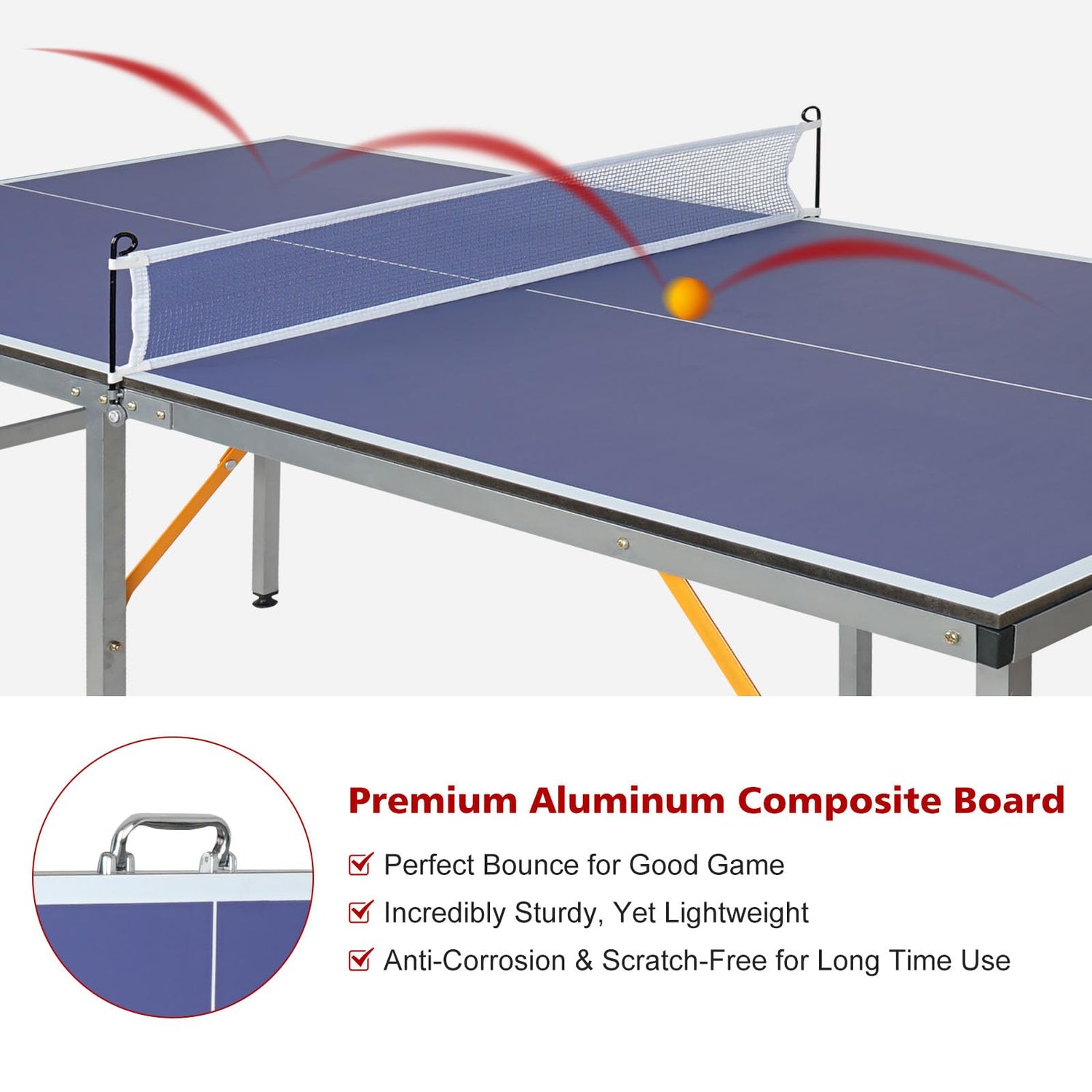 - Structure: Heavy duty aluminum frame, durable, light and rust resistant. Adjustable table legs and rubber suction cups help protect your floor from scratches and keep the game table in place. Table tennis tables are made of high-quality MDF up to 12MM thick to provide consistent bounce across the smooth playing surface.