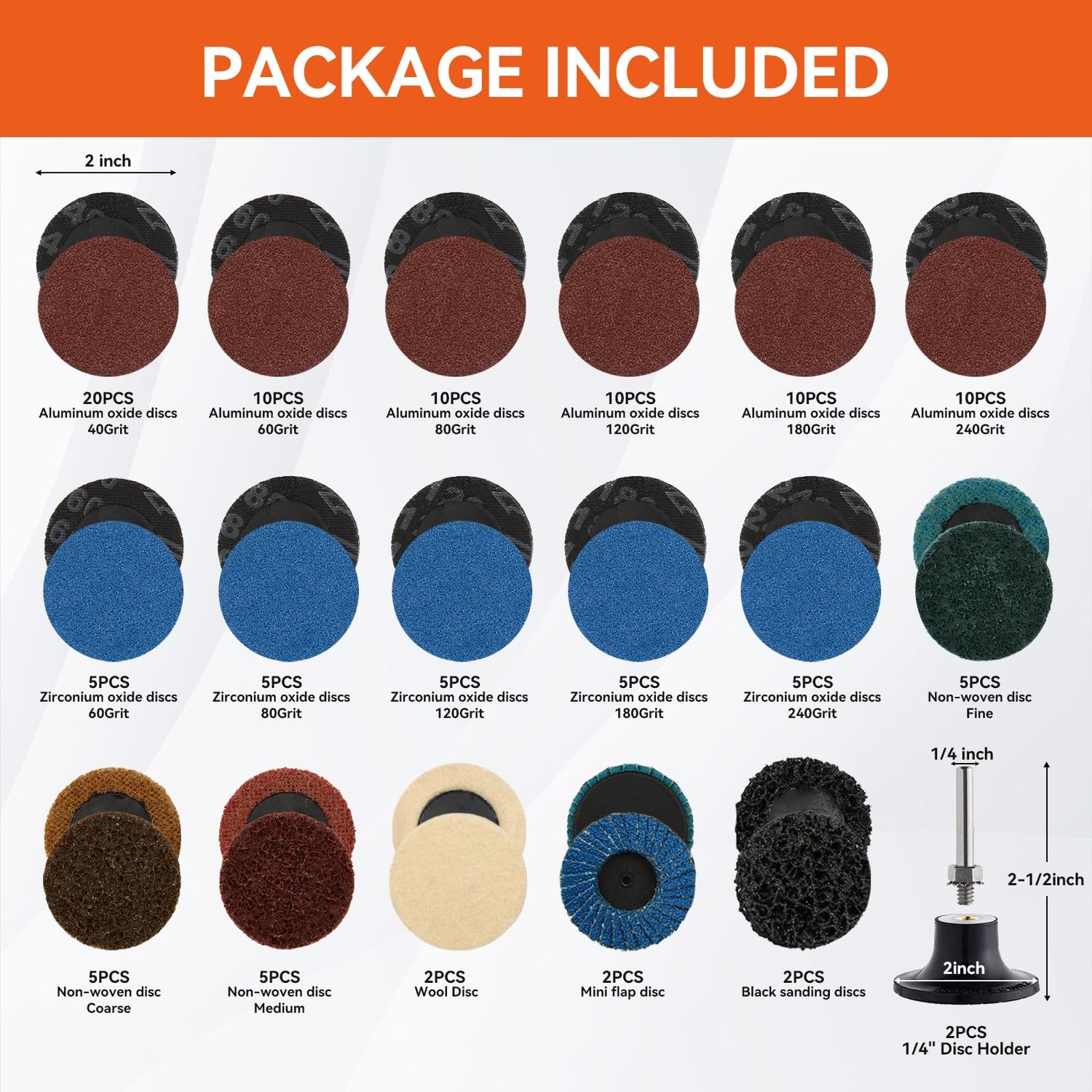 - 【Value Kit】The 2 inch sanding discs set comes with two 1/4'' holders,70 aluminum oxide discs (40#/60#/80#/120#/180#/240#), 15 zirconium oxide discs (60#/80#/120#180#/240#), 15 non-woven discs (coarse/medium/fine), two mini flap disc , two black sanding discs and two wool discs. The die grinder sanding disc grits are indicated on separated packing bags.
