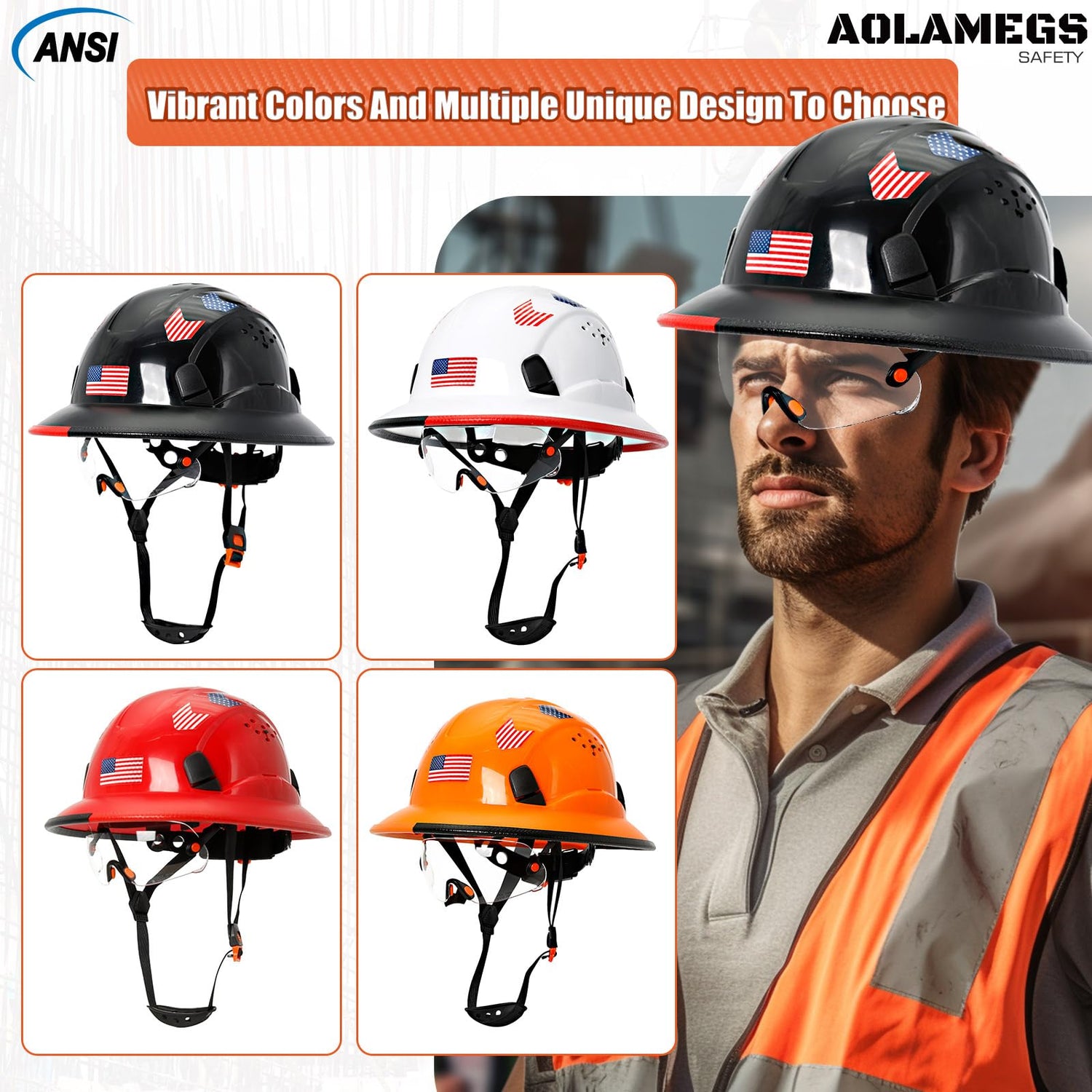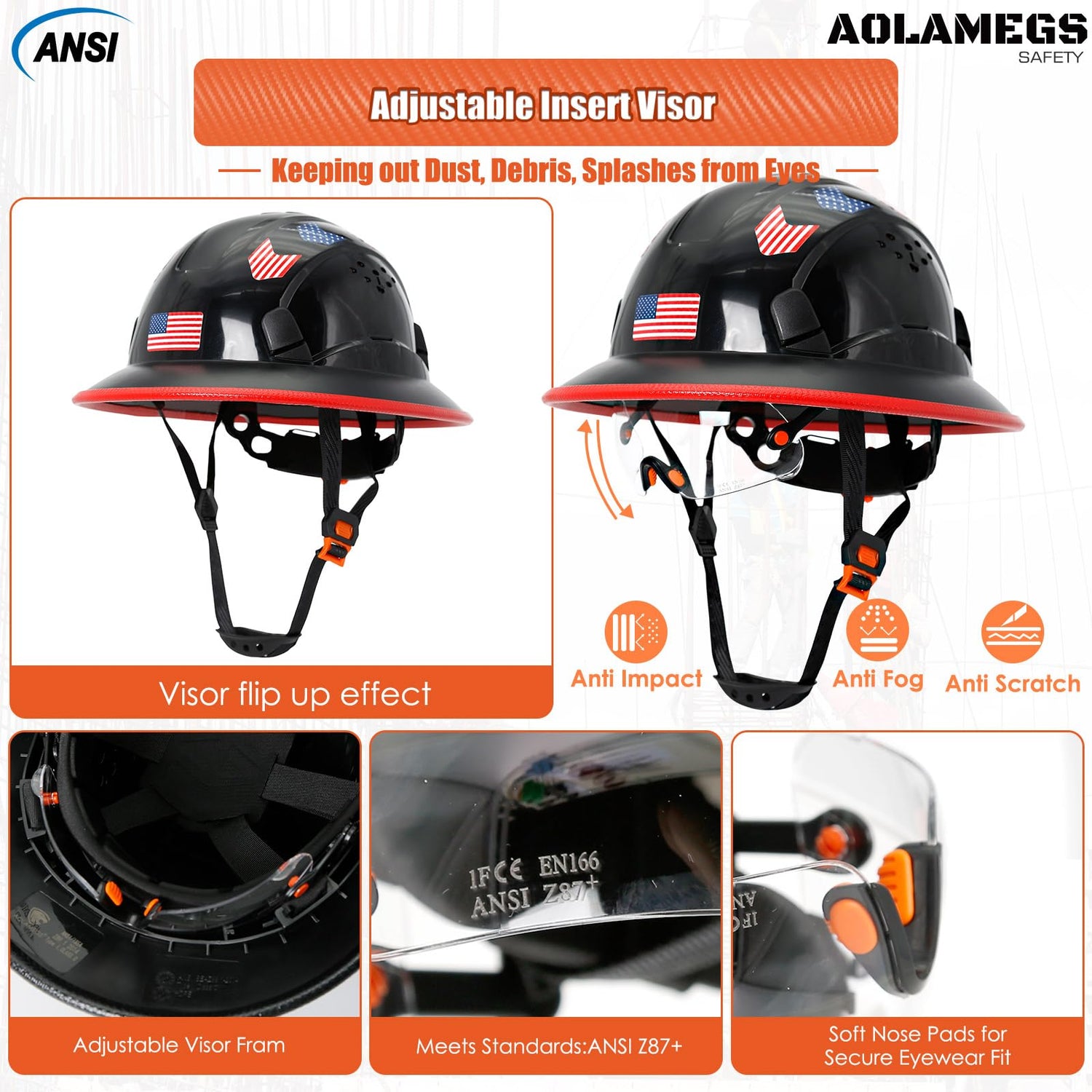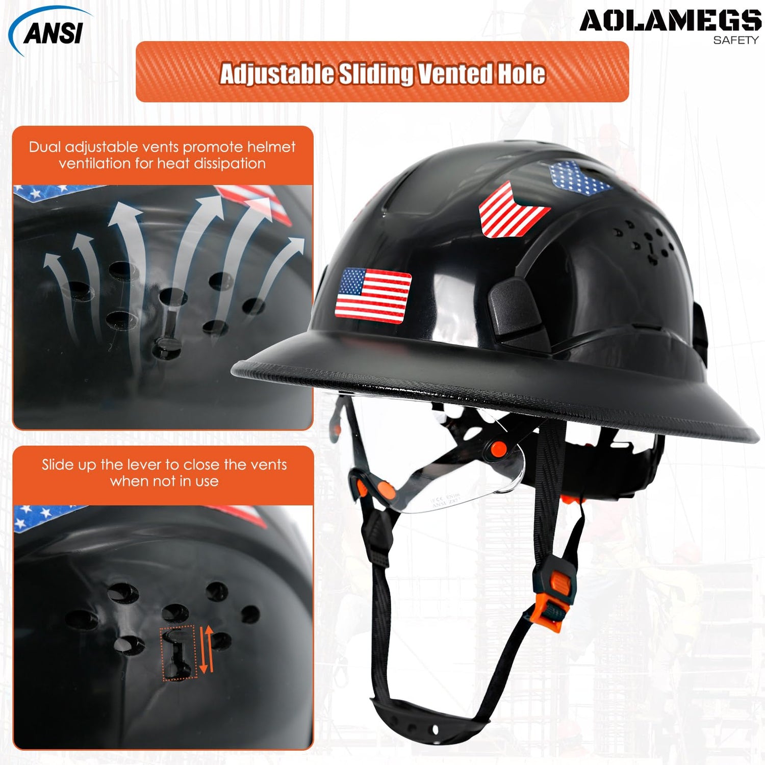 Aolamegs Safe Full Brim Hard Hats Construction OSHA Approved With Clear Visor - ANSI Z89.1 Vented Black Hard Hat With Chin Strap Reflective Cascos De Construccion Safety Helmet for Men 6-Pt Suspension