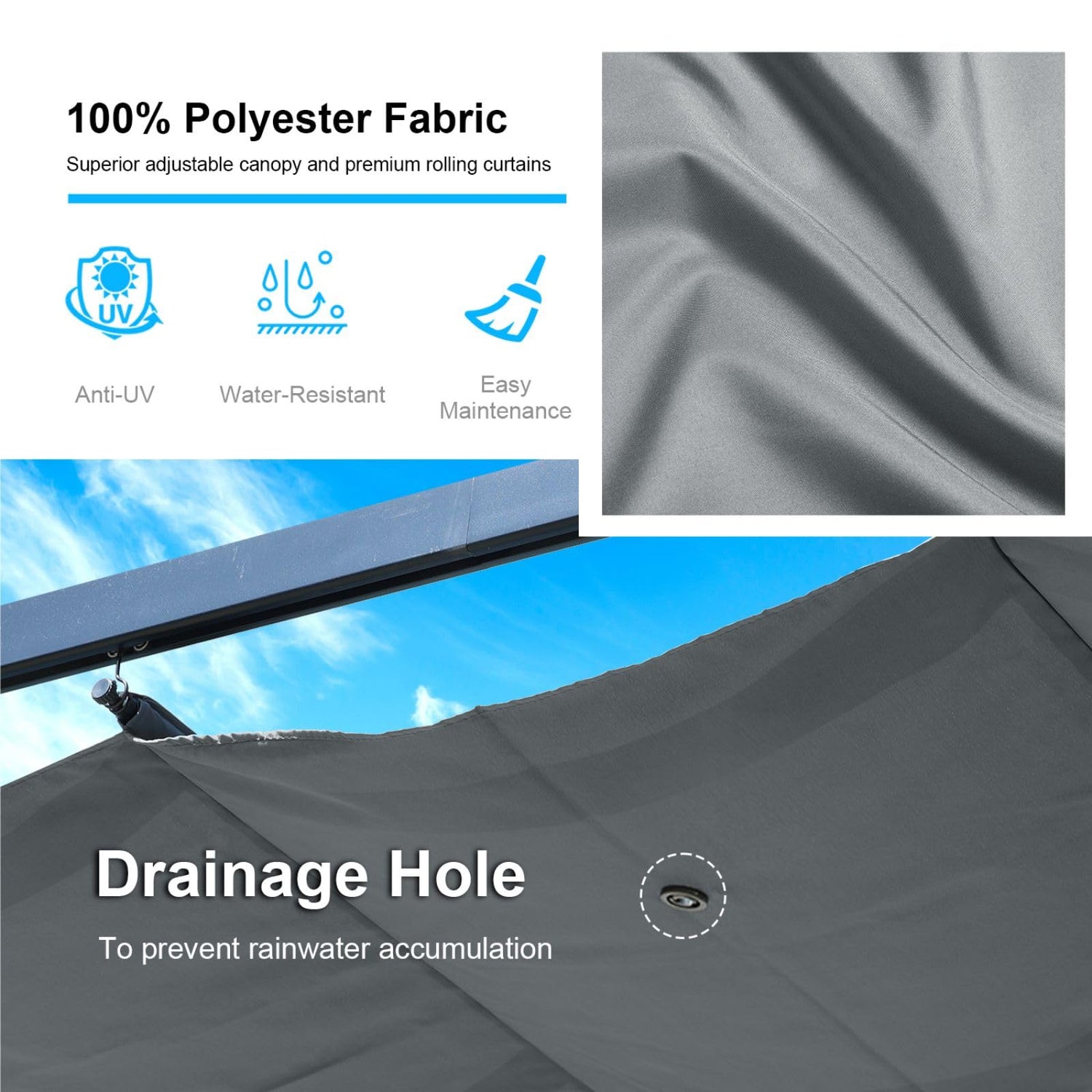 - 【Durable Fabric】- Our pergola canopy and rolling curtains are crafted from premium polyester fiberthat is UV and fade resistant. Coated with PA for water-resistant performance, ensuring long-lasting durability.