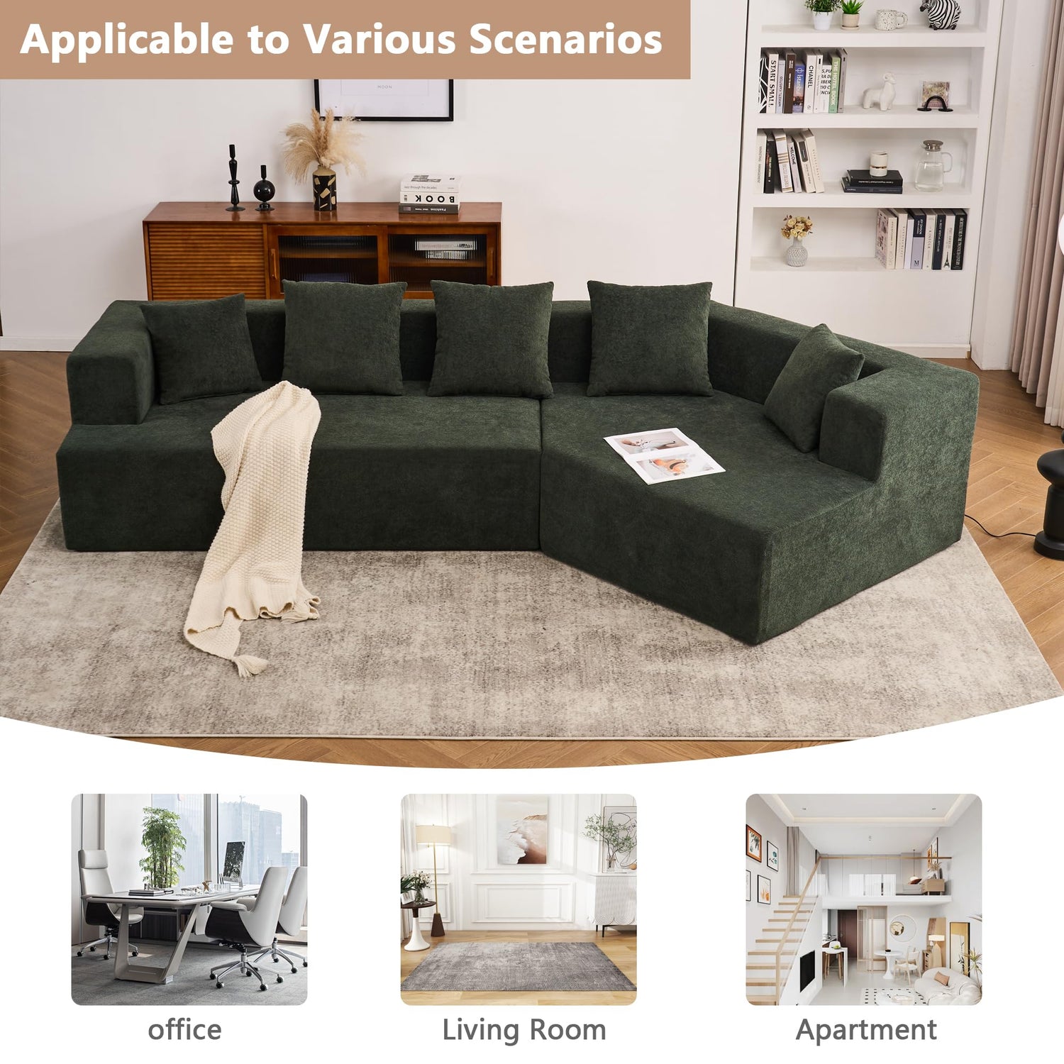 Aoowow 129.5" Modular Sectional Sofa, Modern Minimalist Sofa Comfy Deep Seat L Shaped with 5 Throw Pillows, Memory Foam Couch with Chenille Fabric, 3 Seater Cloud Couch for Living Room, Green