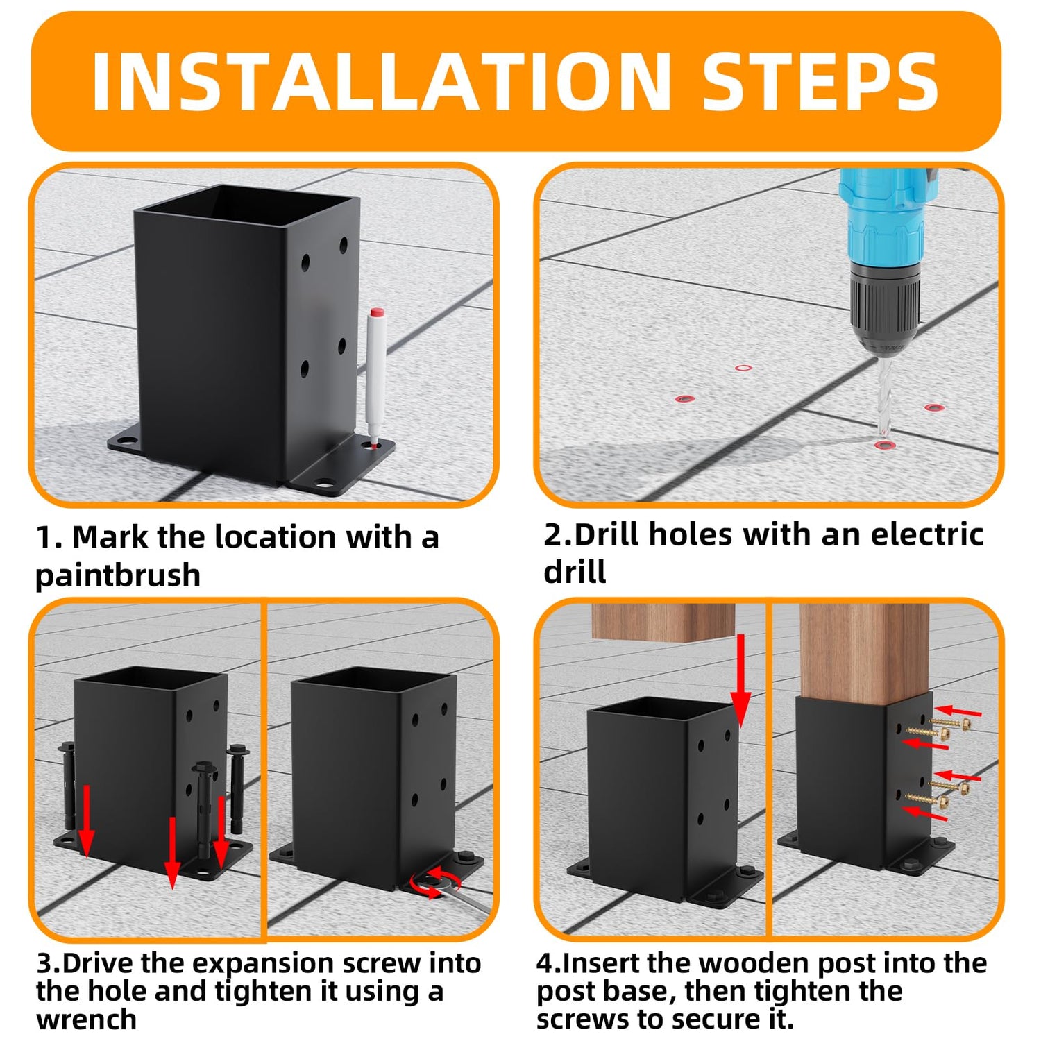 - Complete Accessories: Each set of post base includes a wrench, 16 concrete expansion anchors, and 32 self-tapping screws, ensuring hassle-free installation and secure attachment.