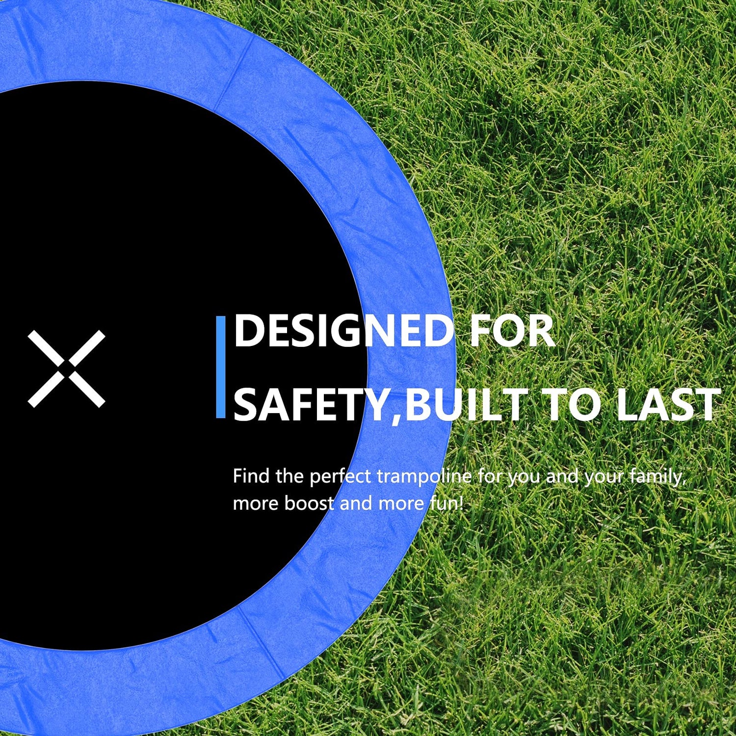 - Trampoline safety is our top priority when jumping happily. We design safety for trampoline. The jump pad and the spring cover are close together to avoid the foot sole being caught by the spring during use.The 12 ft trampoline adopts a widened design, which increases the area used for jumping. The thickened and increased anti-rust steel structure and 4 U-shaped big legs to increase the stability of the trampoline.