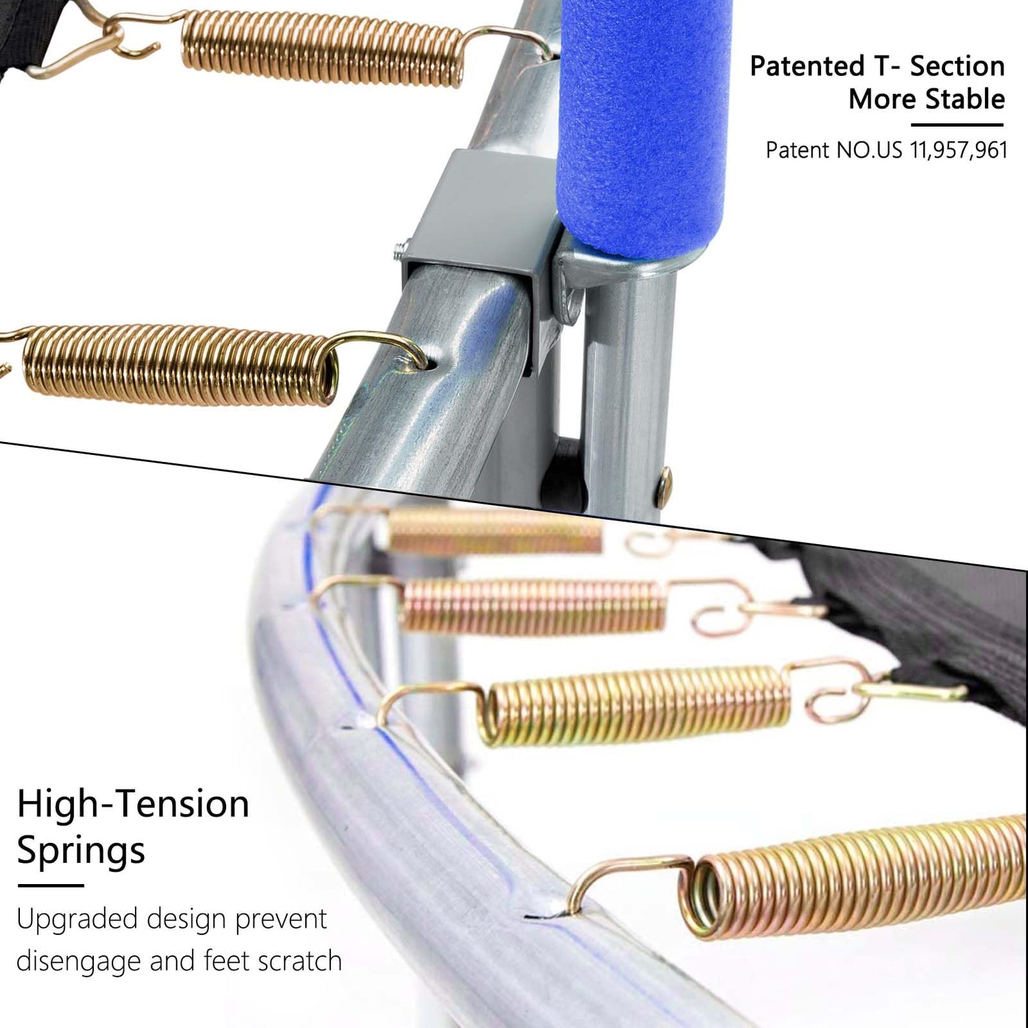 - The sturdy galvanized spring safely connects the tightly woven jump pad and frame together to provide a comfortable jumping force and a deep impression of the jump. 3 solid U-shaped feet ensure that there will be no shaking when jumping.