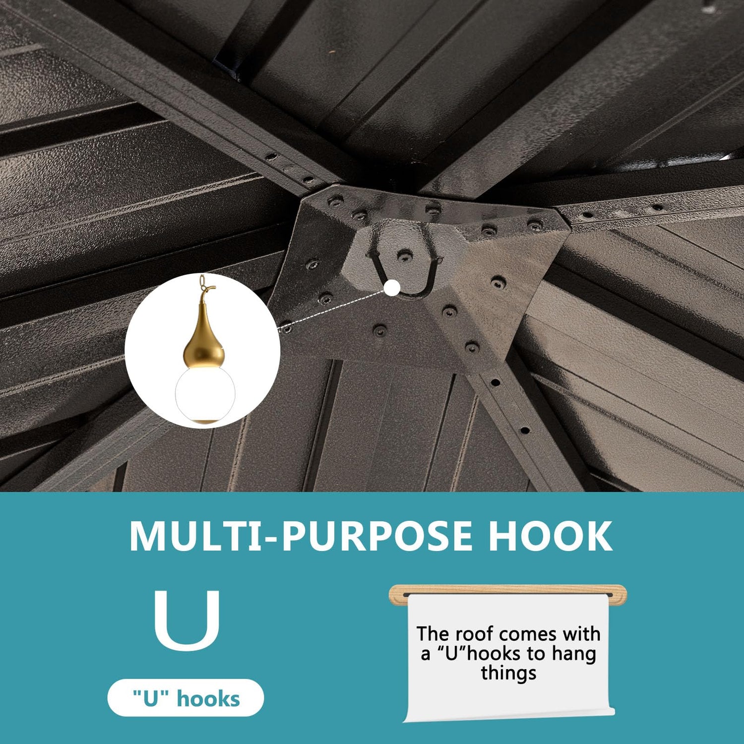 - 【Galvanized Steel Top】 Designed with galvanized steel single roof, the metal gazebo is durable and sturdy enough to withstand bad conditions such as heavy snow, rain and more compared with soft tops. It is able to block most harmful UV rays and prevent water from leaking. Moreover, the structure of the roof is not easy to accumulate rainwater, which prevent the rainwater gathering problems.