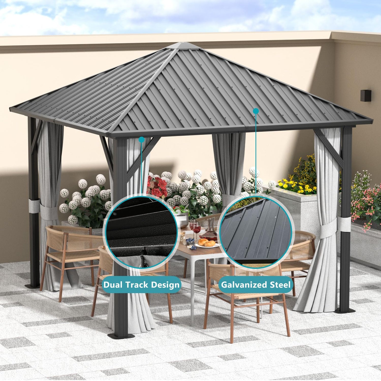 Aoxun 10'x10' Hardtop Gazebo, Galvanized Steel Outdoor Aluminum Single Top Canopy, Everlasting Metal Gazebo with Netting and Curtains, for Patio, Backyard and Deck
