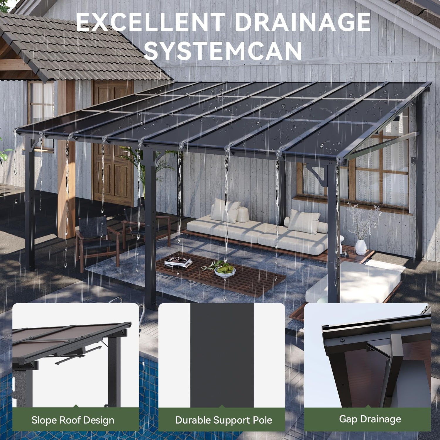 - 【Sloped Roof and Gap Drainage】The sloped roof design make the rainwater run off the eaves smoothly and easily, reducing the problems of water accumulation. Also, this awnings for patio also features gap drainage to help better drain water.