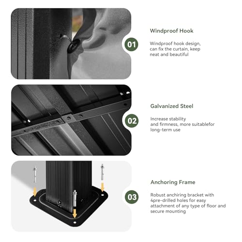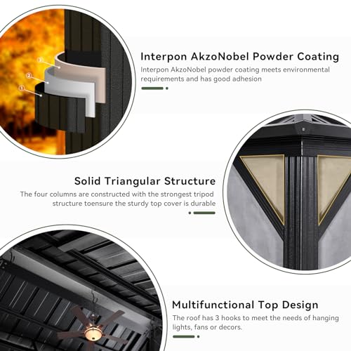 - 【Aluminum Frame】Our product has triangular structure that greatly enhance the overall stability and durability. The patio gazebo is produced in sturdy aluminum frames with more environmentally friendly, high performance, high weather resistance premium Interpon AkzoNobel powder coat that is not easy to scratch, peel.