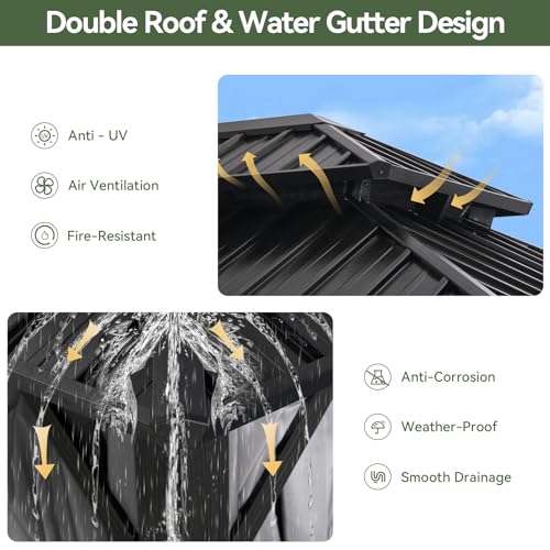 - 【Double Top】Featuring dual-layer top, the gazebo provides better airflow and ventilation compared with single-layer. The heat insulation layer can block most sunlight and reduces heat. It is double-layer water leak proof and can be used all-weather. Reasonable roof slope design can also make water flow out quickly to prevent rainwater from gathering.