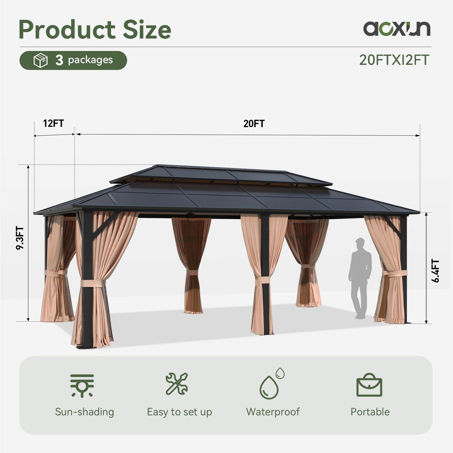 Aoxun 12'x20' Hardtop Gazebo, Aluminum Frame Permanent Pavilion with Curtains and Netting, Outdoor Polycarbonate Double Roof Canopy, Designed for Garden, Lawns, Patio
