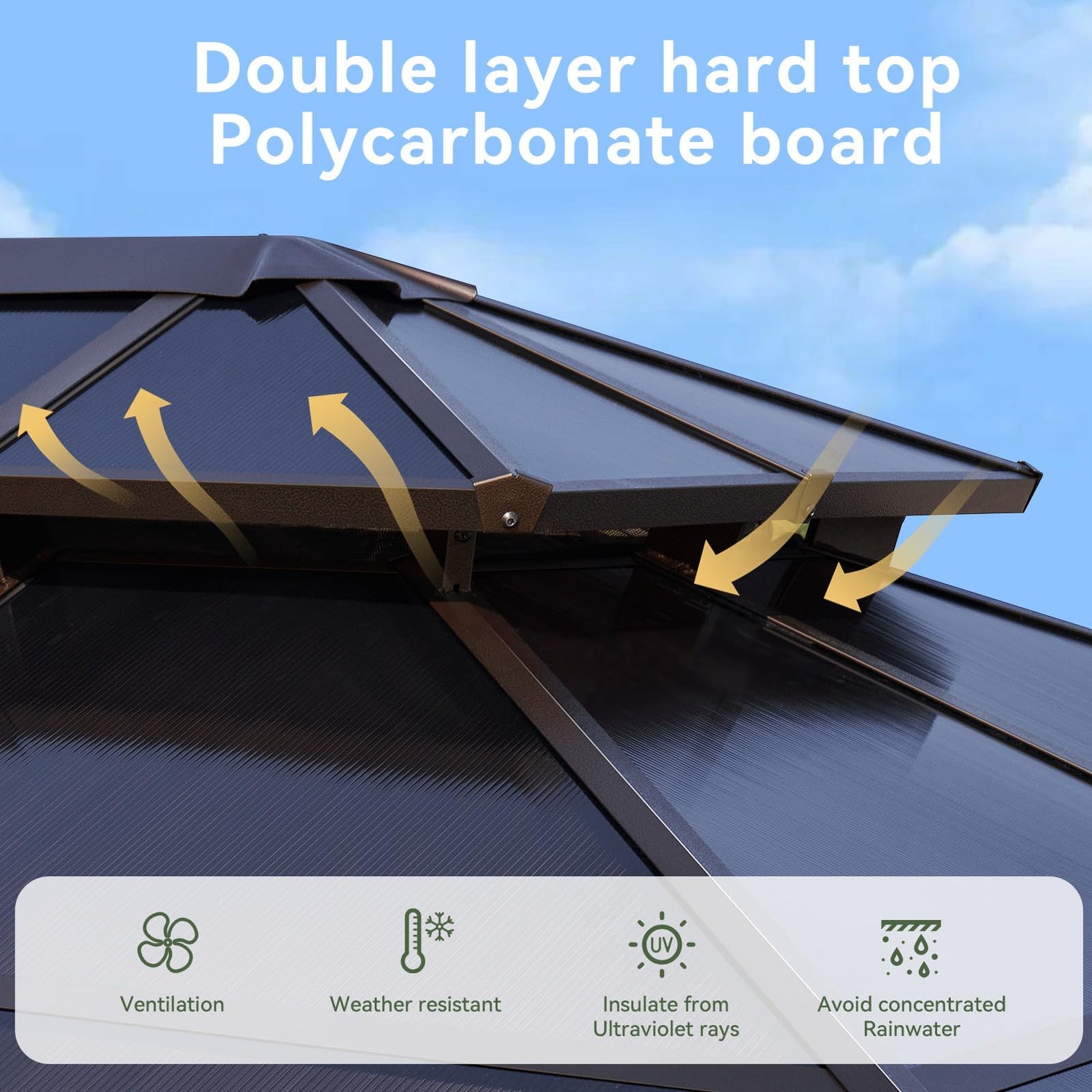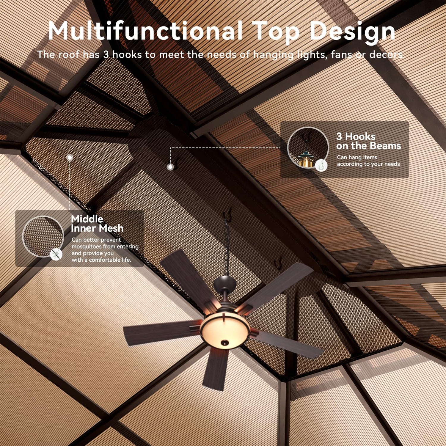 - 【Design of Double Top】This patio gazebo is produced with double-layer polycarbonate top, which prevents harmful UV rays while allowing air circulation. Besides, there are hooks designed in the middle of the steel roof for lamps or fans hanging. Each hook can hold up to 22lbs. (Please note that the polycarbonate roof can only block UV rays rather than high temperatures and strong light).