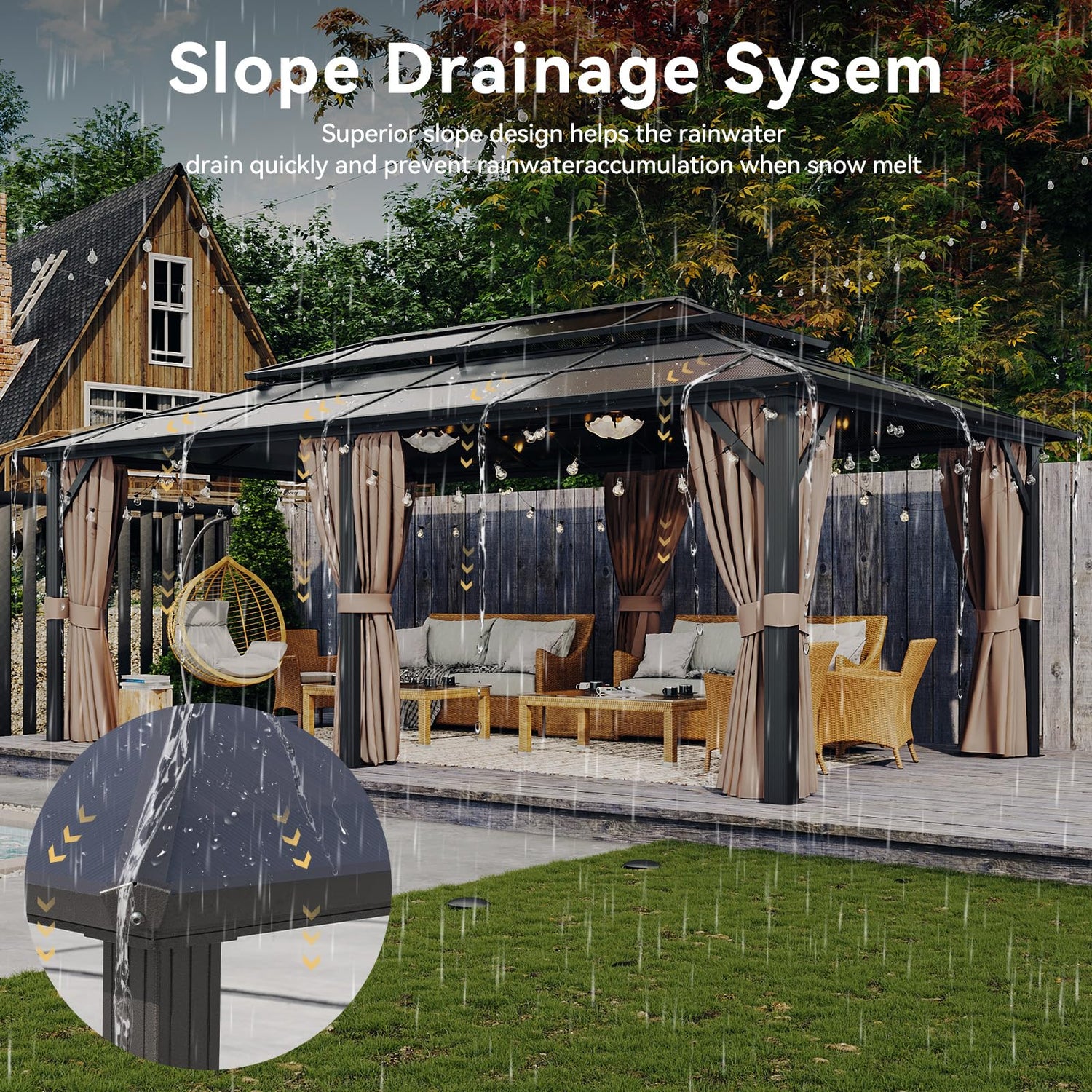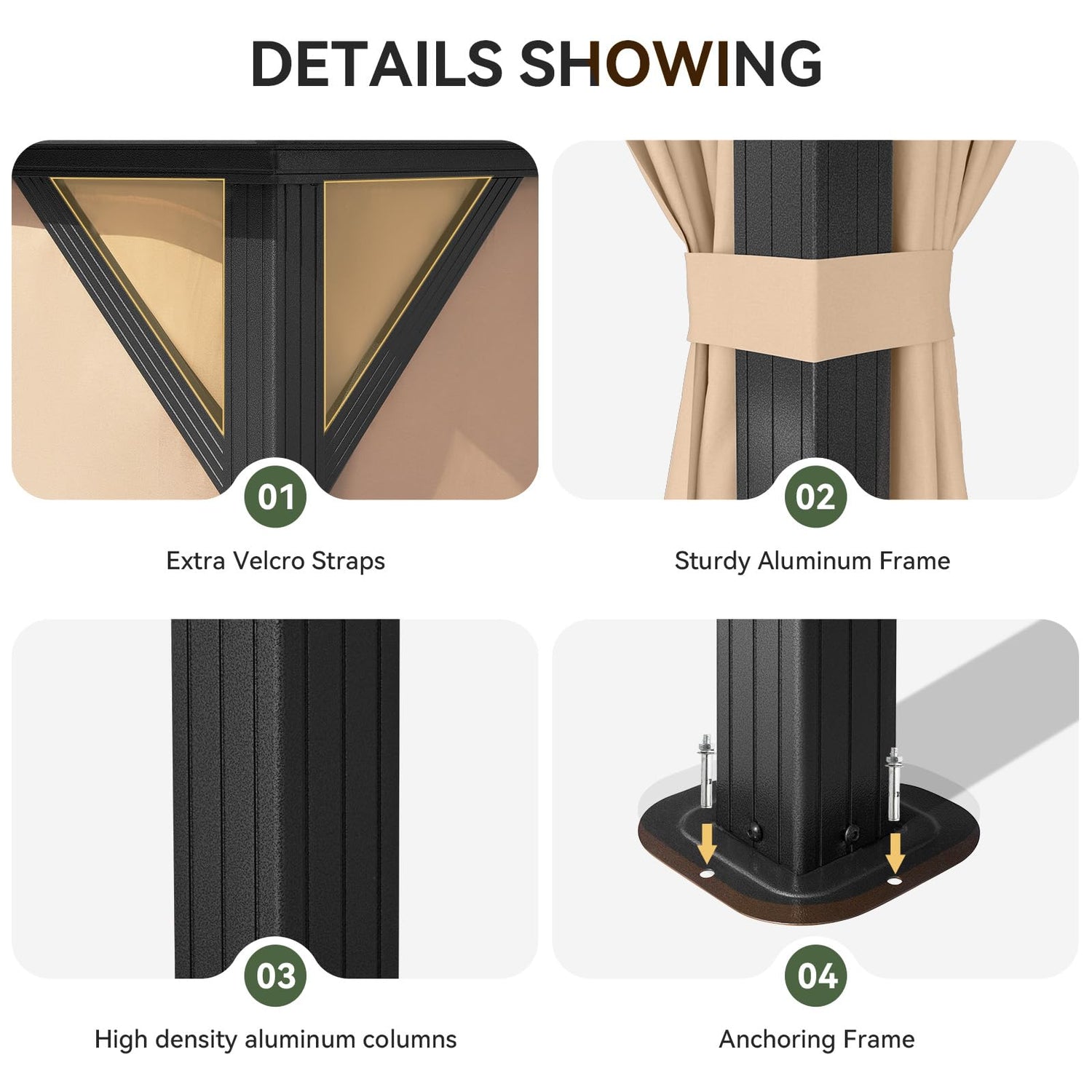 - 【Curtains & Netting】The design of anti-mosquito net can create a more comfortable environment, allowing you to relax and enjoy your time in the gazebo without the constant annoyance of mosquitoes or flies. Also, made by 165g polyester curtains, the hardtop gazebo can provide privacy, keep warm in cold occasions. On the other hand, it has open view and sufficient airflow with the 40g zippered netting. Top hooks enable users to hang fans or other decorations.