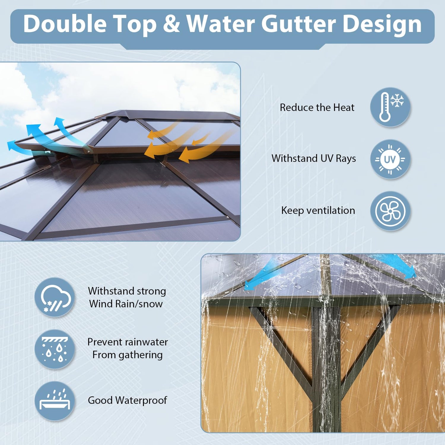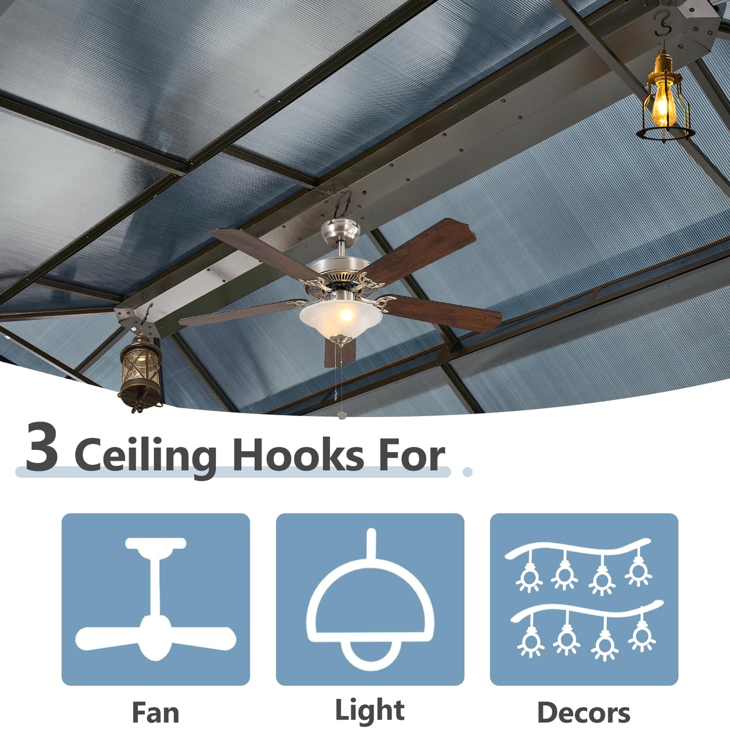 - 【Design of Double Top】This patio gazebo is produced with double-layer polycarbonate top, which prevents harmful UV rays while allowing air circulation. Besides, there are hooks designed in the middle of the steel roof for lamps or fans hanging. Each hook can hold up to 44lbs. (Please note that the polycarbonate roof can only block UV rays rather than high temperatures and strong light).