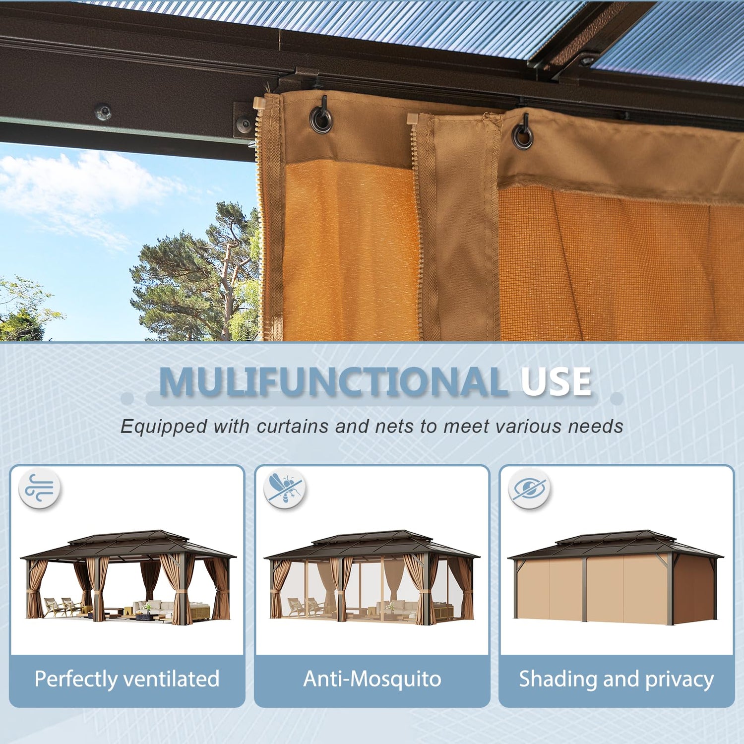 - 【Netting and Curtains】This product is equipped with anti-mosquito net that has the ability to keep out unwanted pests such as mosquitoes, flies, and other insects, allowing you to enjoy the outdoors without worrying about bites or annoying buzzing. Besides, the 180g polyester curtains can provide privacy and keep the gazebo warm in cold occasions. The netting is useful as it can not only offers the open view but prevents mosquitoes from flying in especially during summers.