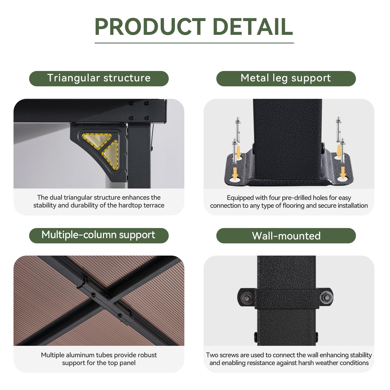 - 【Top-Grade Materials】Our outdoor gazebo shields you from the sun's glare with premium-quality polycarbonate hollow panels, creating a serene and refreshing ambiance. Its durability ensures longevity, withstanding extended use and varying weather elements with ease.