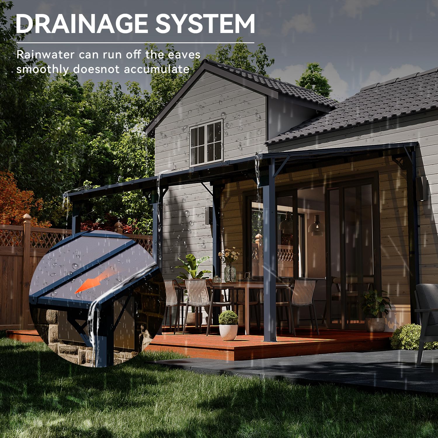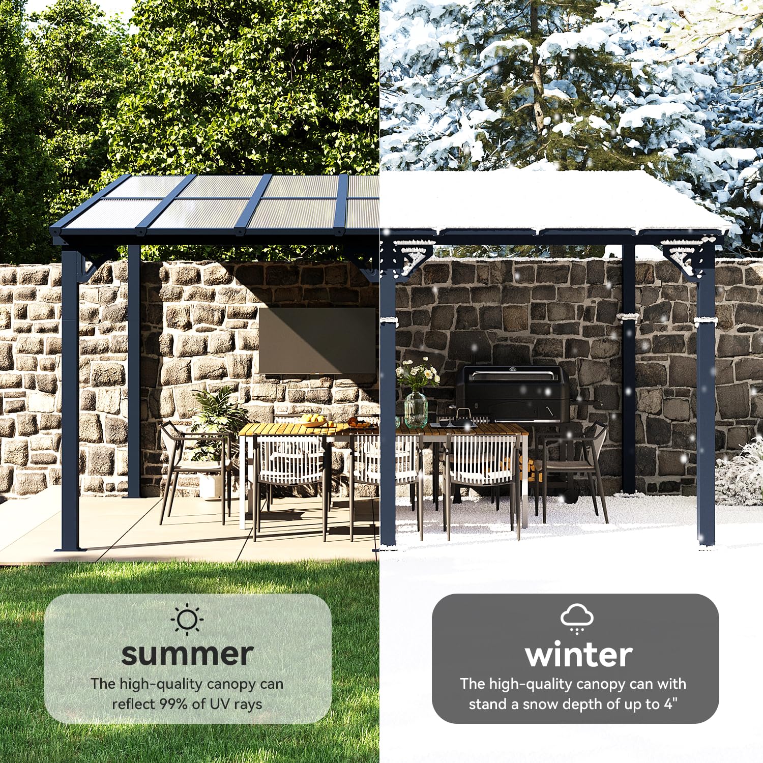 - 【Superior Load Capacity】 Securely affixed to both wall and ground, this pergola boasts a formidable wind resistance range of 31-38mph and effortlessly carries up to 4 inches of snow. Crafted with a remarkable 55lbs/㎡ load-bearing capacity, it stands firm against harsh conditions like heavy snowfalls and downpours.