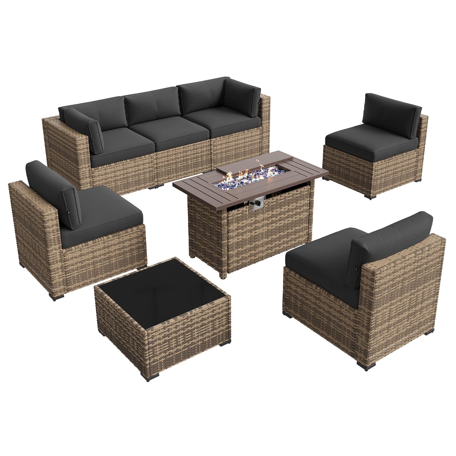 Aoxun Patio Furniture Sets, 8-Piece Outdoor Patio Furniture with 44'' Propane Gas Firepit Table, Wicker Outdoor Conversation Set Sectional Sofa for Backyard, Poolside, Garden (Black Cushion)
