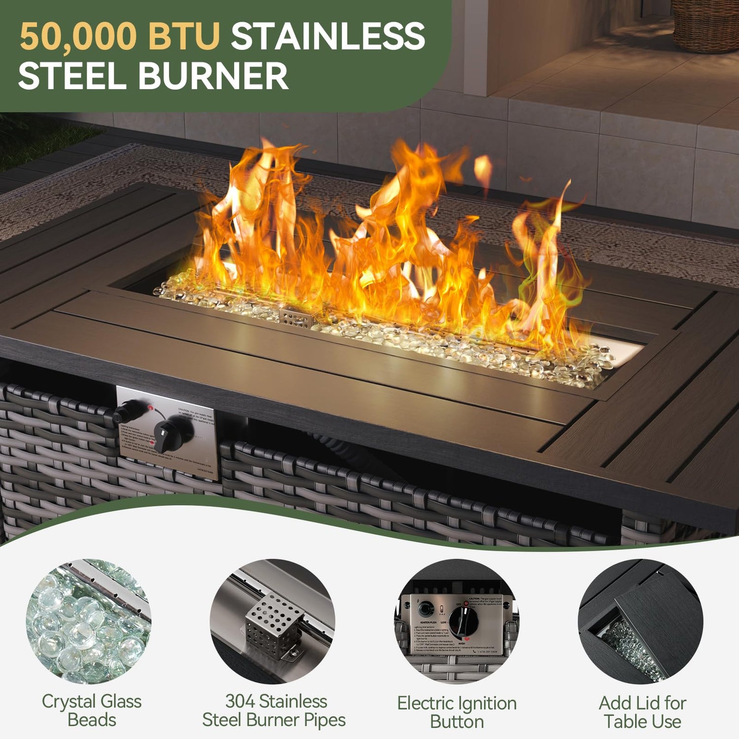 - 【Warmth, Ambiance & Uncompromising Safety】Elevate your outdoor experience with the 50,000 BTU fire pit table, radiating cozy warmth year-round—whether it’s a crisp autumn evening or a chilly winter night. CSA-certified and designed with explosion-proof glass stones, anti-leak valves, and adjustable heat control, it blends stunning visuals with peace of mind. The pure copper wiring and studry hose ensure reliable performance, making it the heart of your outdoor sanctuary