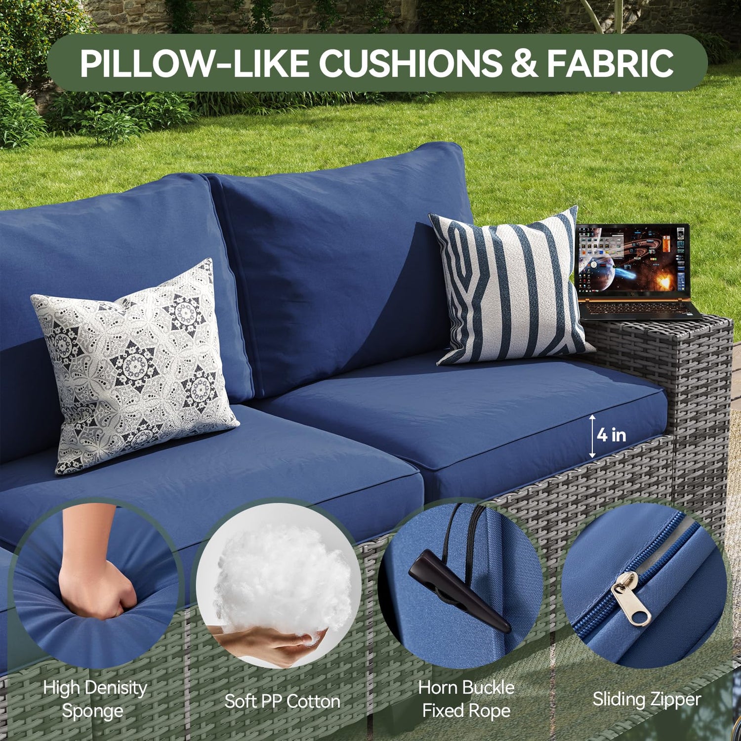 - 【All-Weather Durability & Effortless Care】Built to endure the elements, this patio set combines UV-resistant resin wicker with rustproof steel framing, standing strong against sun, rain, and snow. Fade-proof and crack-resistant retains its beauty season after season. The cushion fabrics shrug off light splashes, while the included waterproof cover offers extra protection during heavy downpours or storage. Plus, detachable, machine-washable covers and wipe-clean surfaces make maintenance a breeze