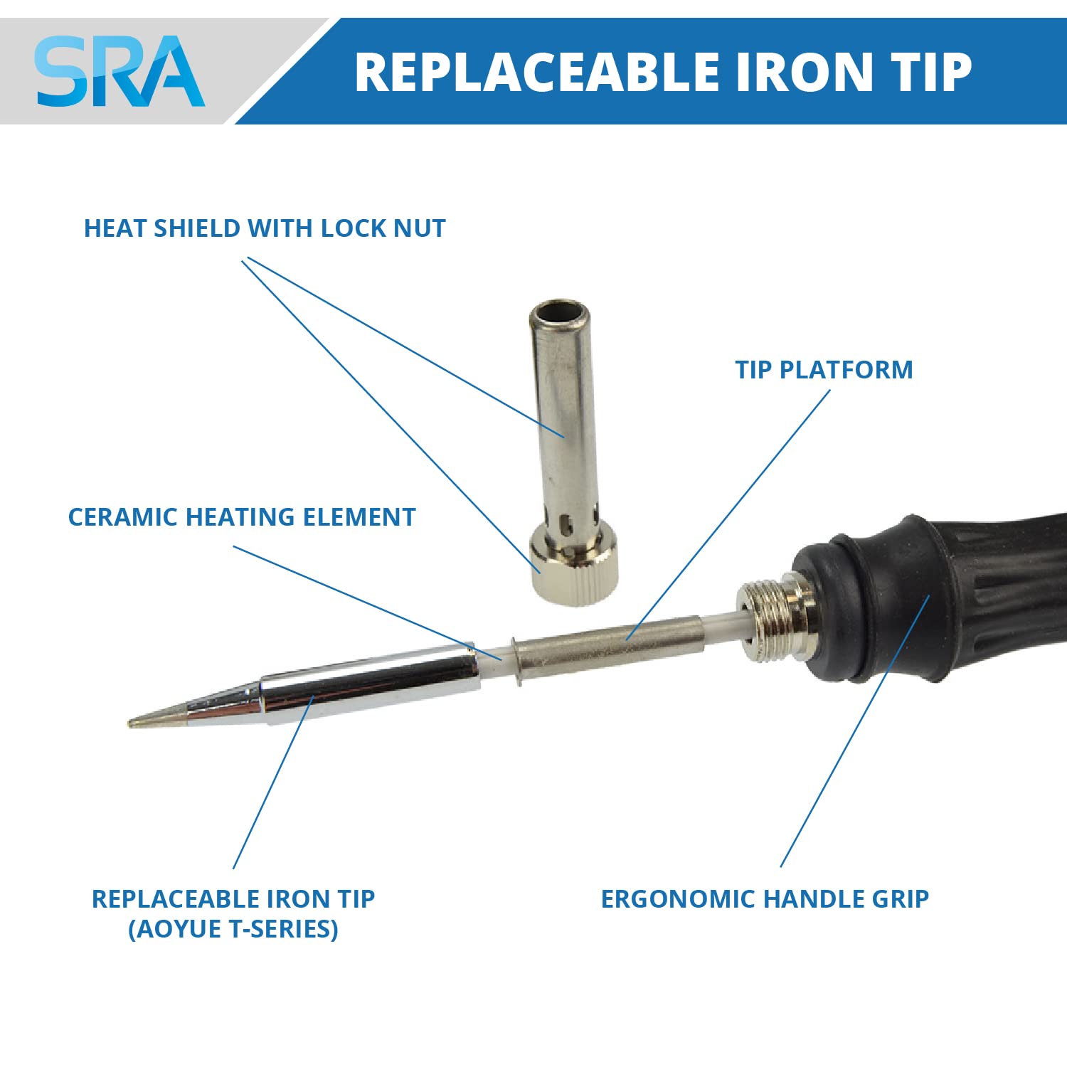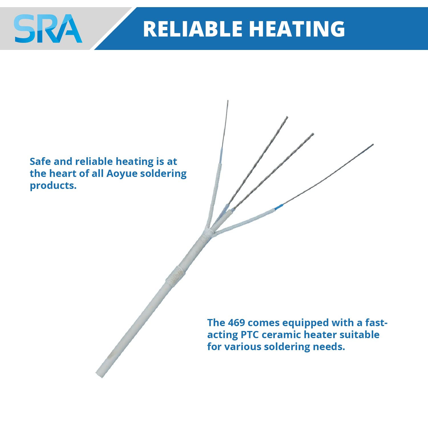 Details: The Aoyue 469 is a high performance soldering iron at a reasonable price. It is equipped with a fast acting PTC ceramic heater suitable for advance soldering needs. The separate tip and heater design offers cost efficiency and easy replacement of tips. This uses standard "T" types of tips.