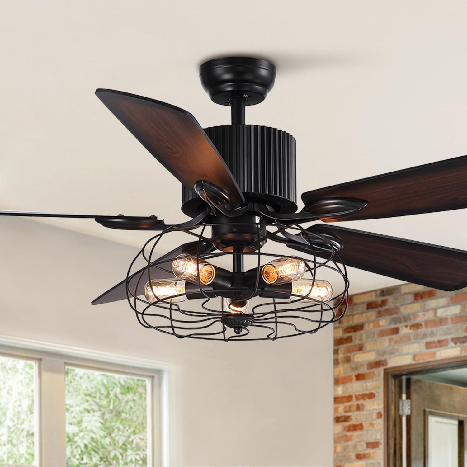 APBEAMLighting Industrial Caged Ceiling Fan Light with Remote Control 52 Inch Vintage Ceiling Fan Light Farmhouse Black Retro Indoor Fandelier with 5 Reversible Wood Blades for Living Room Bedroom