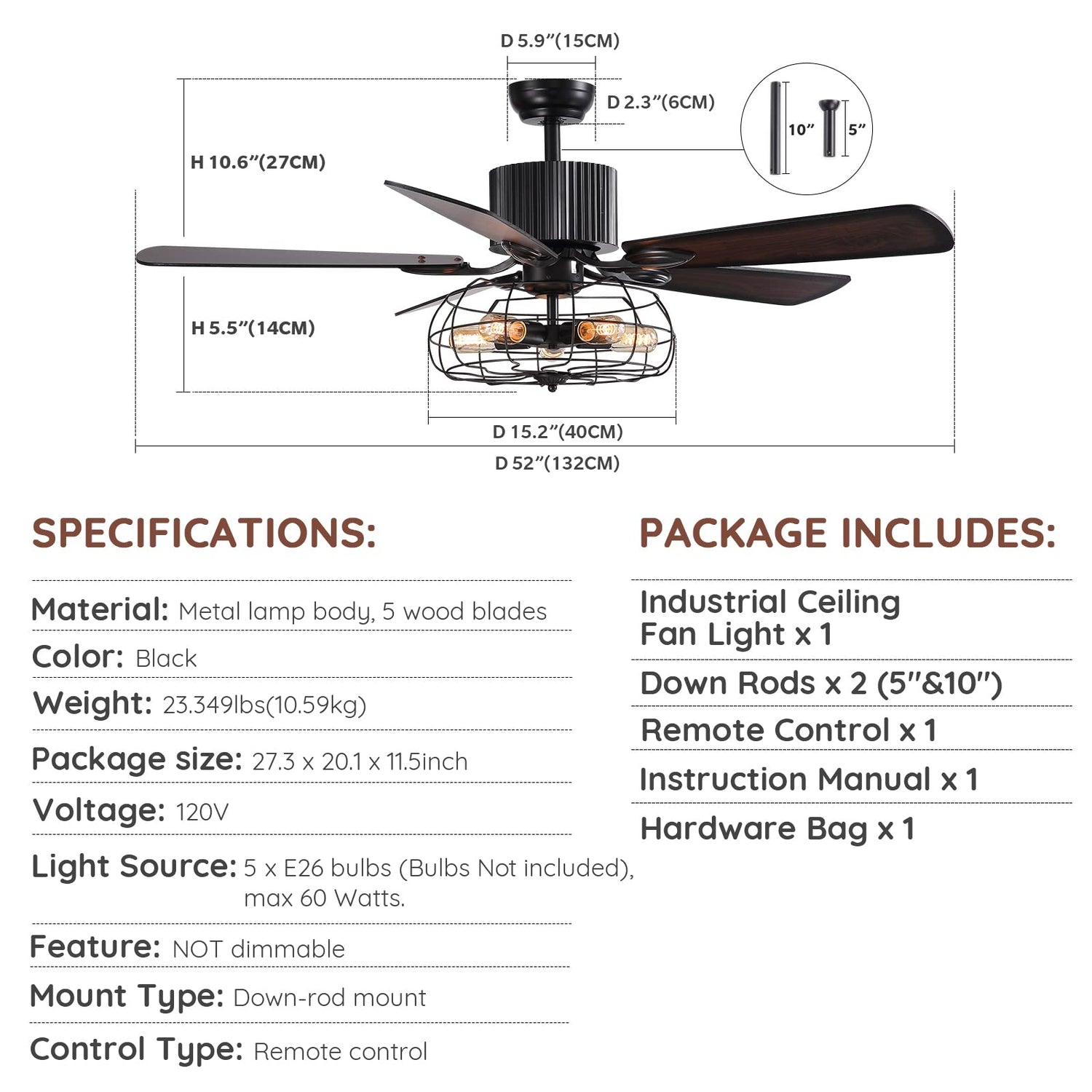- DIMENSION & TWO DOWNRODS OPTIONS: The total diameter of the farmhouse caged ceiling fan light is 52''(132cm), and the lampshade size is D15.7''(40cm) x H6.7''(17cm). Parcel with two downrods(5'' & 10''), total height is H19.3"(with 5"rod) / H24.2"(with 10"rod).
