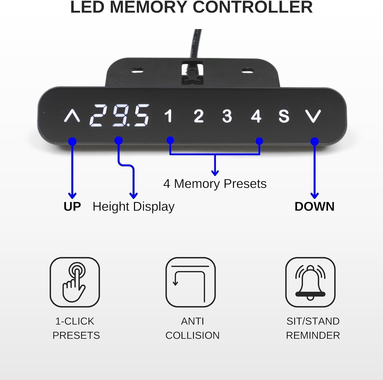 - Electric Height Adjustment: The desk is equipped with a powerful electric motor and a programable controller with 4 presets that allow you to easily adjust the height of the desk that can be easily adjusted anywhere between 25” and 50.5". This feature promotes flexibility and reduces the negative effects of prolonged sitting.