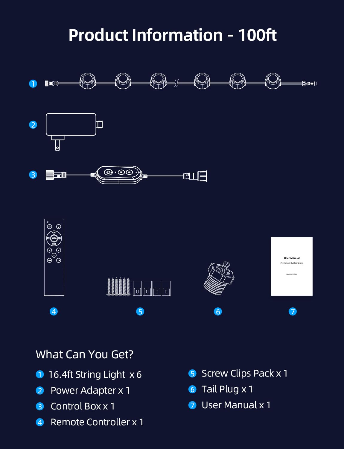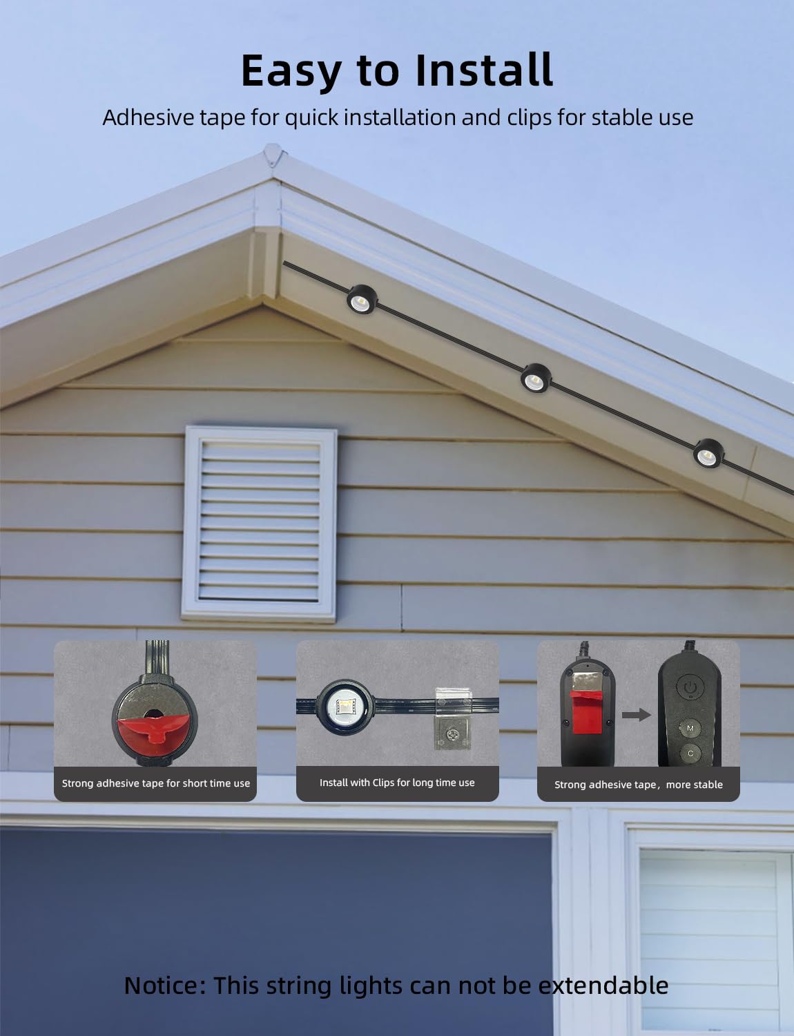 - Outdoor Durability & Reliability: Specially designed for outdoor permanent lighting, the string lights and control box are IP65 waterproof rating, UV resistant, cold and high temperature resistant(-20~60℃/-4~140℉). No matter stormy or cold, the smart outdoor lights can provide the perfect lighting effects for your house, lighting up to 50,000 hours