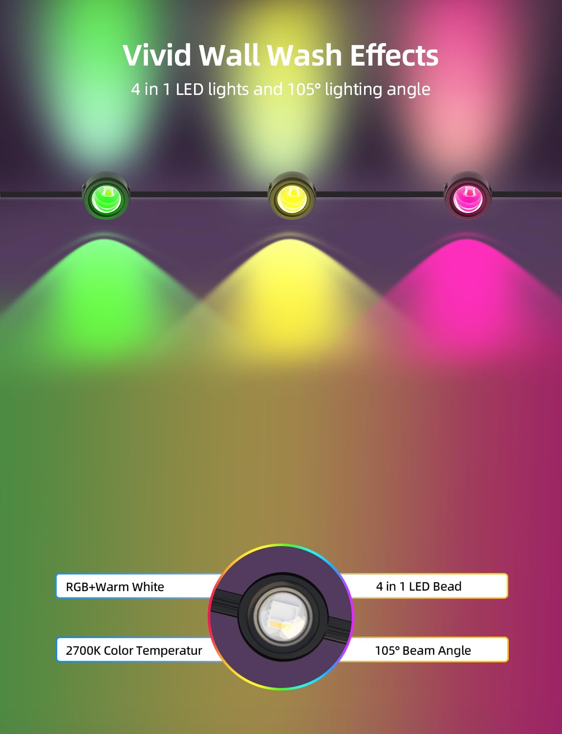- Vivid Lighting Effects: 4-in-1 RGB+WW lens design with beam angle up to 105° and the wall washing depth up to 16 inches. It is recommended to install the lights 2-4 inches away from the wall surface. With 2700K color temperature, the warm white light brightness up to 40lm each, good for daily lighting. RGB brightness up to 25lm each, creating personal ambiance. This string lights support color changing and brightness adjustable