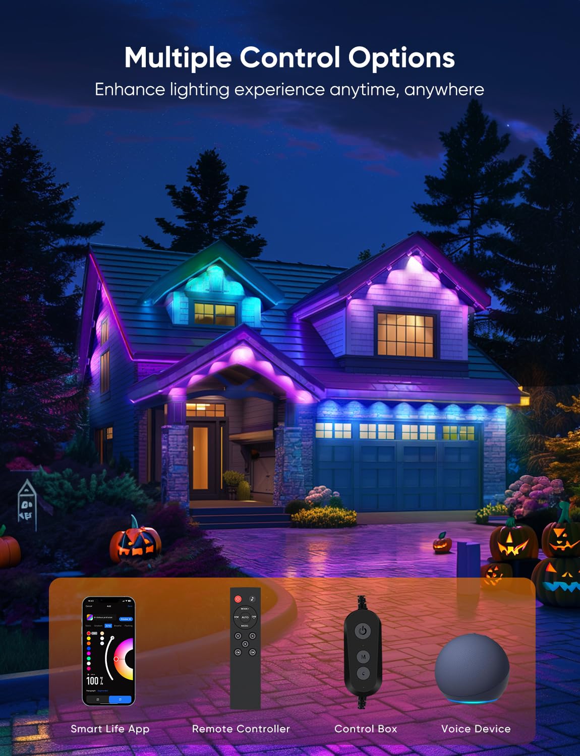 - Multiple Control Methods: The smart eaves light offers 4 different control methods: App control(2.4G Wi-Fi), voice control with Alexa and Goggle Assistant, remote control in weak WiFi and controller box for on/off, reset and brightness adjustment. Each family member can choose a different control method. Note: the remote control does not include AAA batteries