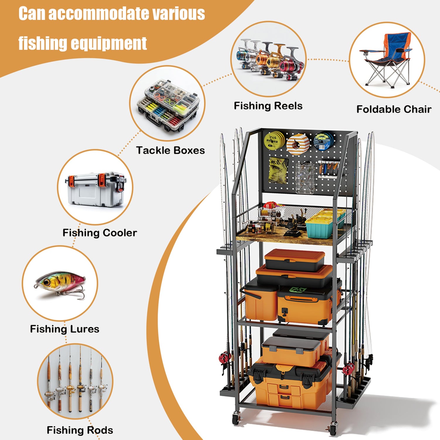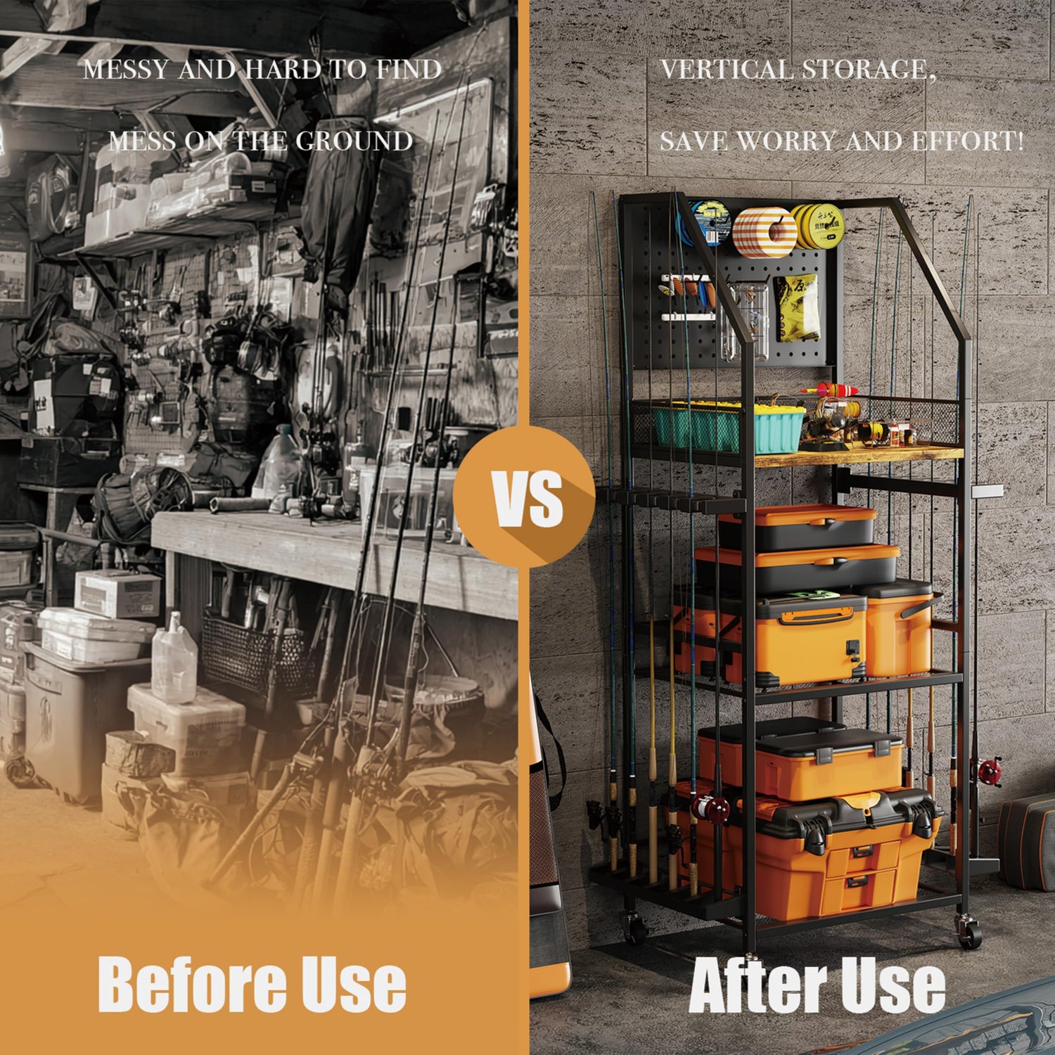 - 🎣【Easy to move and flexible storage】Equipped with 4 smooth and silent universal wheels, it can be moved freely, whether it is a balcony, garage, or outdoor camp, it can be easily pushed and switched at any time, and the fishing rod rack is more efficient.