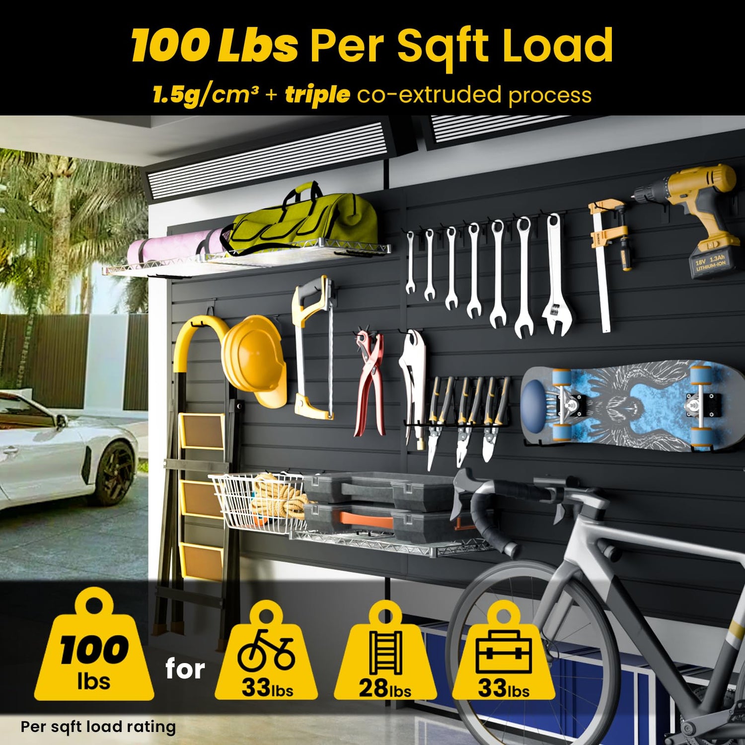- 【Modular free splicing pegboard tool organization】AQOVOR's heavy-duty slatwall panels are constructed with four 1x4 ft standardized sized slatwall panels, offers 16 square feet of infinitely expandable storage. Interlocking design allows seamless solo or combined use, customizable via cutting for perfect spatial adaptation. Ideal for garage, home, workshop, retail, gym, office, factory & beyond – redefine walls into organized powerhouses