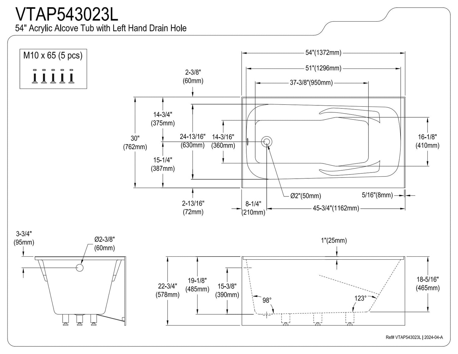 Aqua Eden VTAP543023L 54-Inch Acrylic 3-Wall Alcove Tub with Arm Rest and Left Hand Drain Hole, White