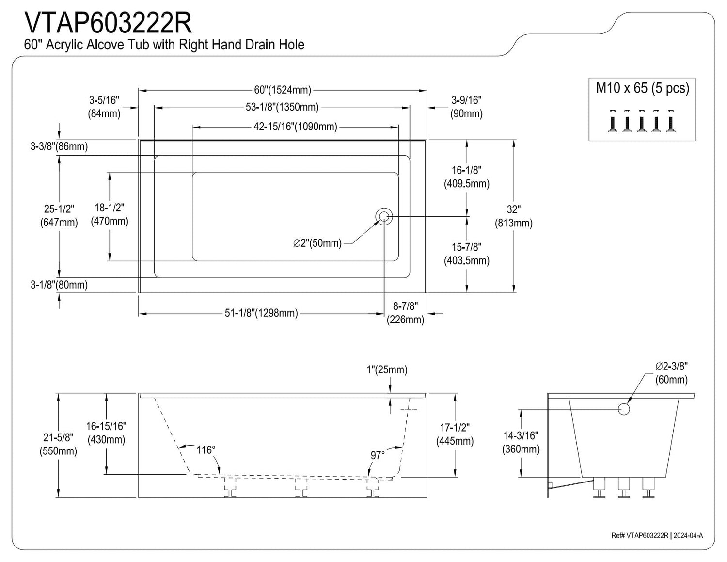 - Acrylic thickness: inner tub 3.5mm, bottom 16mm, wall 5mm and rim 9mm