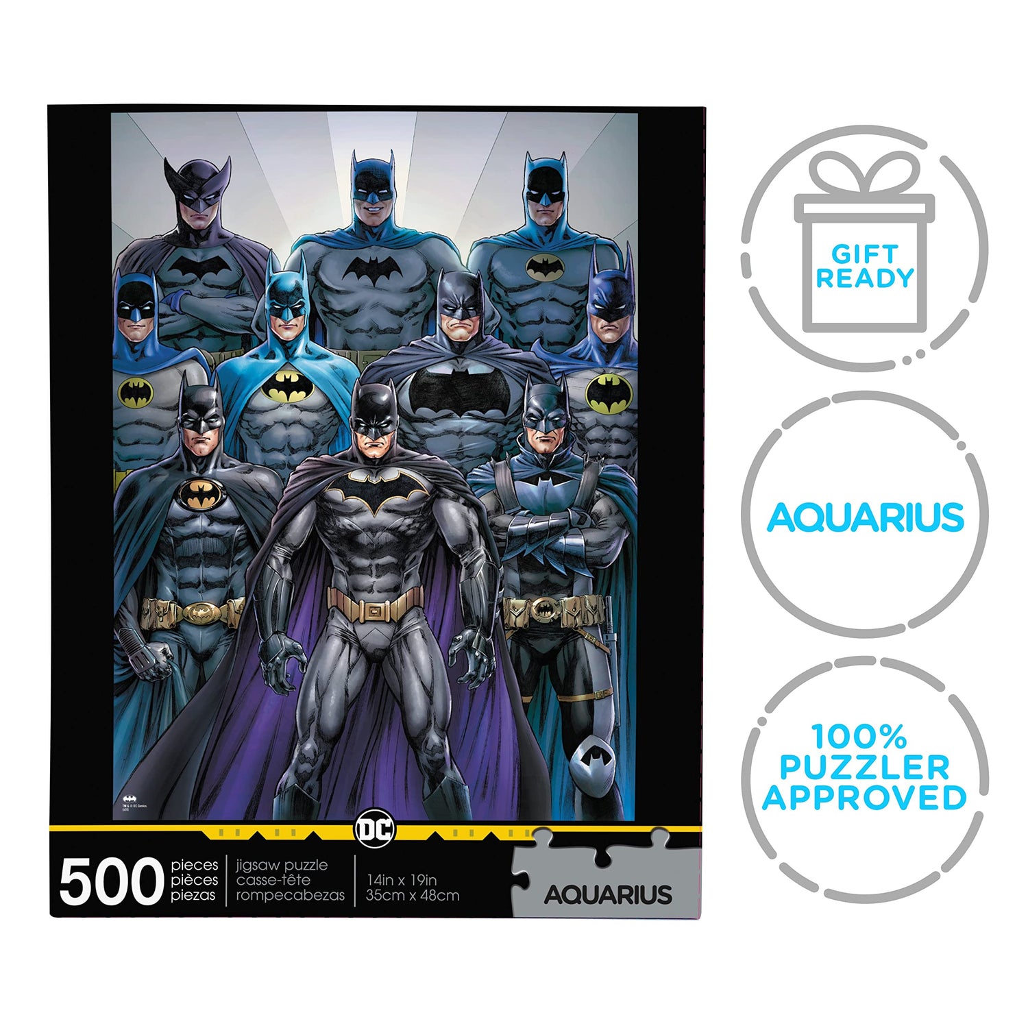 - UNLOCK YOUR INNER SUPERHERO… Charge into the DC Universe with Batman, and rise to the challenge of completing this 500 piece puzzle depicting the Dark Knight as he appeared over the decades. The completed puzzle measures 14 x 19 inches