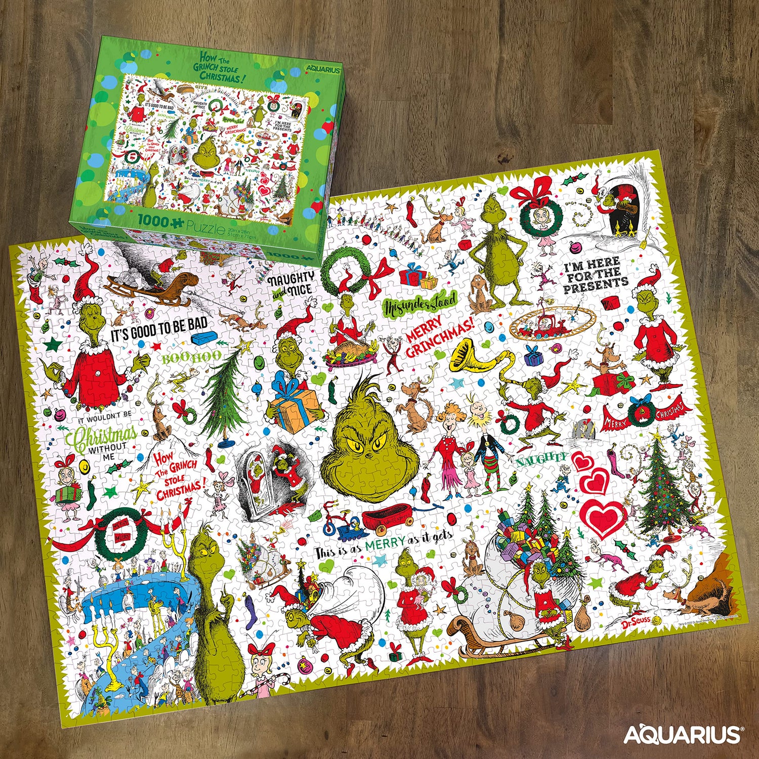 Details: 1000 PIECE JIGSAW PUZZLE: Fans will have a blast completing this 1000 piece puzzle featuring a collage loaded with imagery of your favorite Christmas foe, The Grinch. This unique puzzle measures 20 x 28 in and fits in a standard size frame.. LOOKING FOR GRINCH GIFTS? This Grinch Collage puzzle is the ultimate gift for Grinch fans of all ages. Perfect for family puzzling, game night, birthdays, holidays, kids and adults will absolutely love receiving it as a gift. PREMIUM QUALITY YOU CAN TRUST: Our precision cutting technique ensures a perfect fit of all puzzle pieces, leaving virtually no puzzle dust behind. We use thick quality paper that is glare-free so you can show off your masterpiece with pride 100% OFFICIALLY LICENSED GRINCH MERCHANDISE: This Grinch Collage puzzle is designed by AQUARIUS, officially licensed, and 100% authentic. It's the perfect piece of Grinch collectible memorabilia to add to your collection.