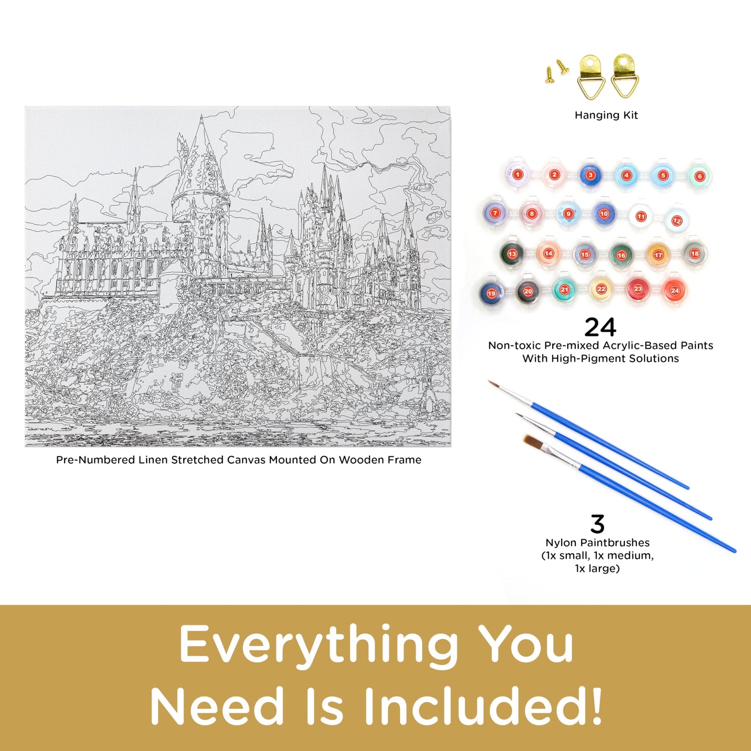 Details: BEGINNER FRIENDLY PAINT BY NUMBER KIT: Enjoy creating your own masterpiece with this Harry Potter Hogwarts paint by number kit. This art by numbers kit will help you create a stunning work of art and decrease stress. Suitable for kids and adults INCLUDES EVERYTHING YOU NEED: Our paint by numbers kit are complete with 24 paint canisters, 3 high quality nylon paint brushes, pre-stretched 16" x 20" canvas on a wooden frame and the hanging kit to showcase your masterpiece once complete LOOKING FOR HARRY POTTER GIFTS? This Harry Potter paint by number kit is the ultimate gift for Harry Potter fans of all ages. Perfect for birthdays, white elephant, Holiday gifts, Christmas, weddings, parties, kids and adults will absolutely love receiving it 100% OFFICIALLY LICENSED HARRY POTTER MERCHANDISE: All our Harry Potter paint by number kits are designed by AQUARIUS, officially licensed, and 100% authentic. They're the perfect piece of Harry Potter collectible memorabilia to add to your collection